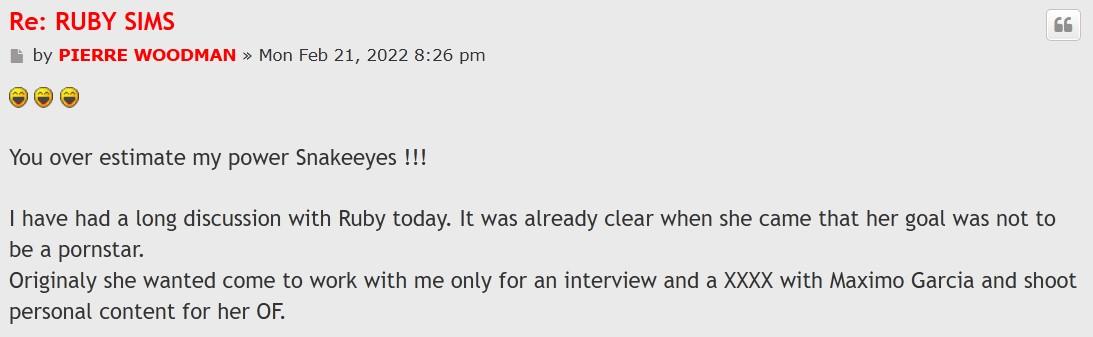 Responding to Scarlett Jones' video on Rocco, Ruby Electra/Sims say this... I wonder who Ruby Electra/Sims is talking about here with: "I once had someone tell me to "stop crying" while shooting a scene because I'd been pressured into doing something I didn't want to do. They did not stop filming."