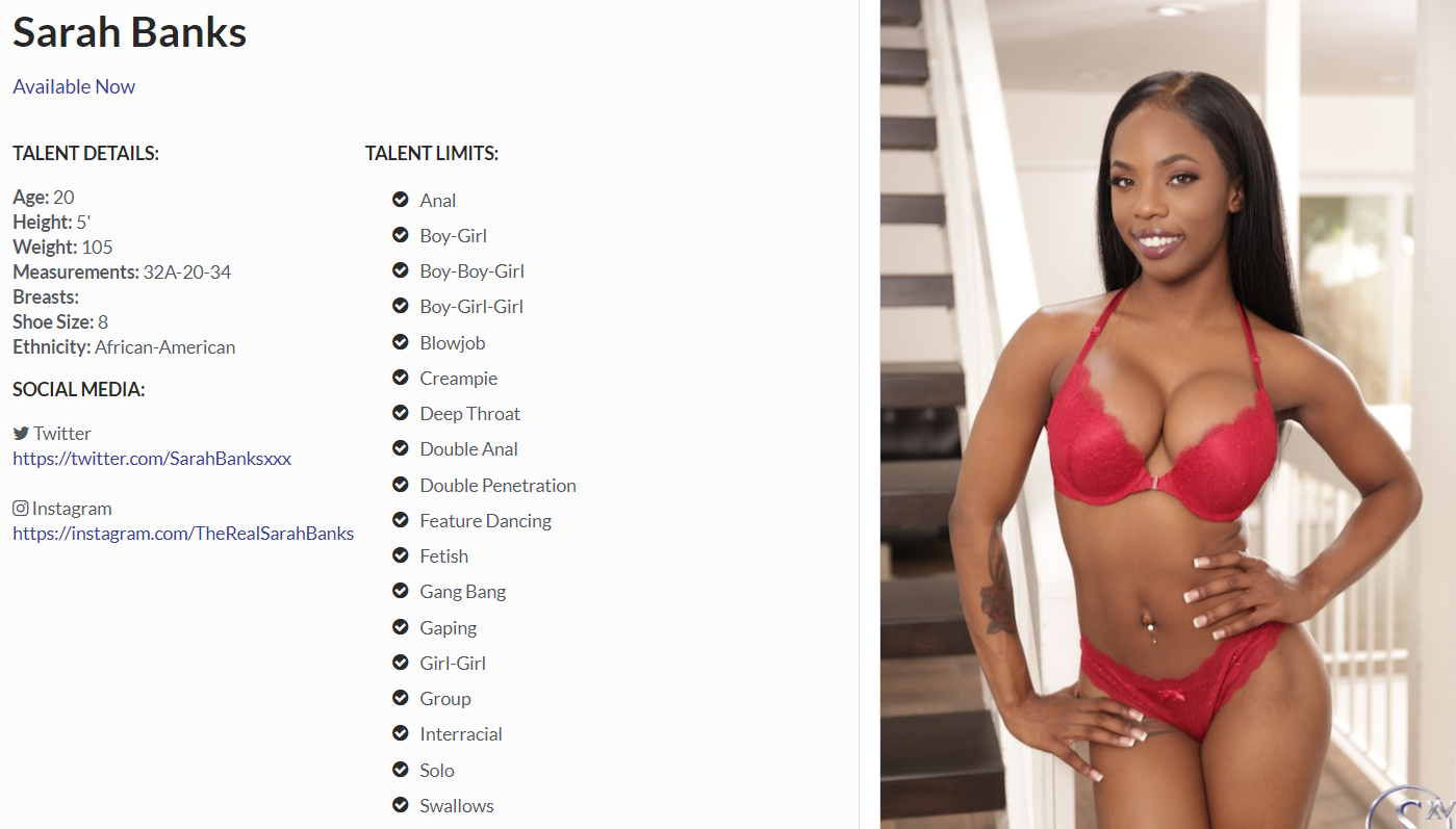 jeremyliu wrote:Sarah Banks please! This gorgeous black goddess is ready for DAP, she's already done DP. Double anal is listed on her agency page.