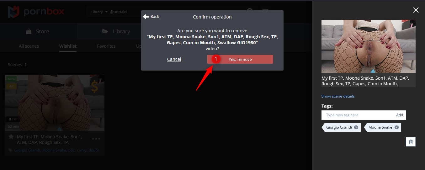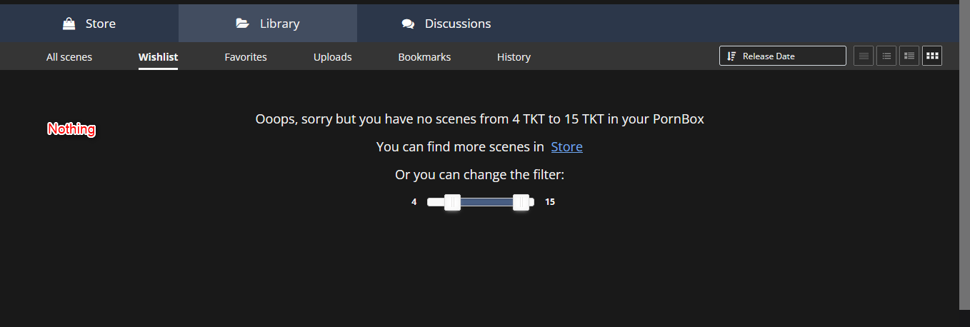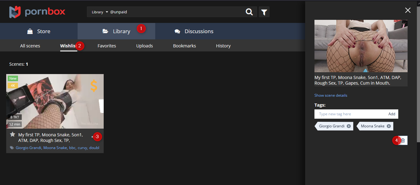 Hi, first at all, 1 - go to your "Library" section in PornBox, 2 - later go to your "Wishlist" section (you should have the proper TKT range to see the scenes using the filter like in the last pic) and you must see your scenes in that section.
