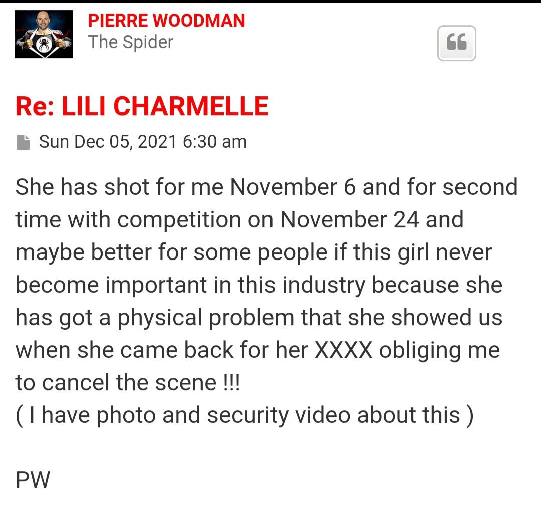 Off course now he creates another shitstorm by saying the new girl Lili Charmelle had a physical problem when she came back to him from her shooting with the Disciples of Desire. He has camera footage apparently. This man never minds his own business and always talks how people discredit him but look what he does now...big allegation to his competition to suggest this girl was "assaulted" from her set with Disciples of desire because that's what I understand when he says physical problem that he had to cancel the shoot and chase her away. So please tell us Woodman why you lie about these things and your camera and security footage??? What is it going to prove?So if a girl has few marks on her body from sexual situation then it means she is assaulted??? Ok lets talk about how you hit the girls so hard on their ass that make the girls ass turn blue on your castings That time all is fine??? Or whem their asshole start to bleed. Which planet are you living on that you can blatantly ignore your own wrong doings and pretend you are a saint?You even admitted on your own forum that you made some girls ass turn blue how you beat her. But when a girl shows up om your set with a few marks yoi want to play the police again.