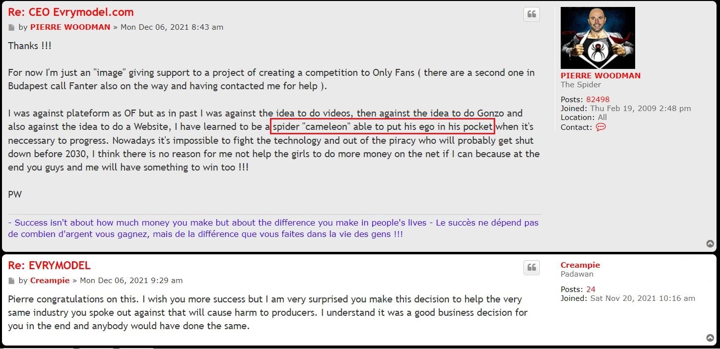 Everything he spoke about [spam] was all bullshit, pretending he was against the idea but somehow suddenly producers and models can work together on it now??? How it changed??? Yeah the money that went into your pocket was too good to not betray your own beliefs and morals and words, even your own industry colleagues. He's a hypocrite who change like a chameleon all the time. One day he shit talk and hate something, next day he love it same stoey with the girls. But when it comes to money, he is prepared to look the other way and pretend like nothing happened. So he hates the idea of models doing their own content because it's bad for producers like him and there is more piracy, but then he takes the money to join then and all is fine again. What about all the bullshit he talk about piracy...now his CEO of a platform that will steal videos from God nows whose private home and put on that website.