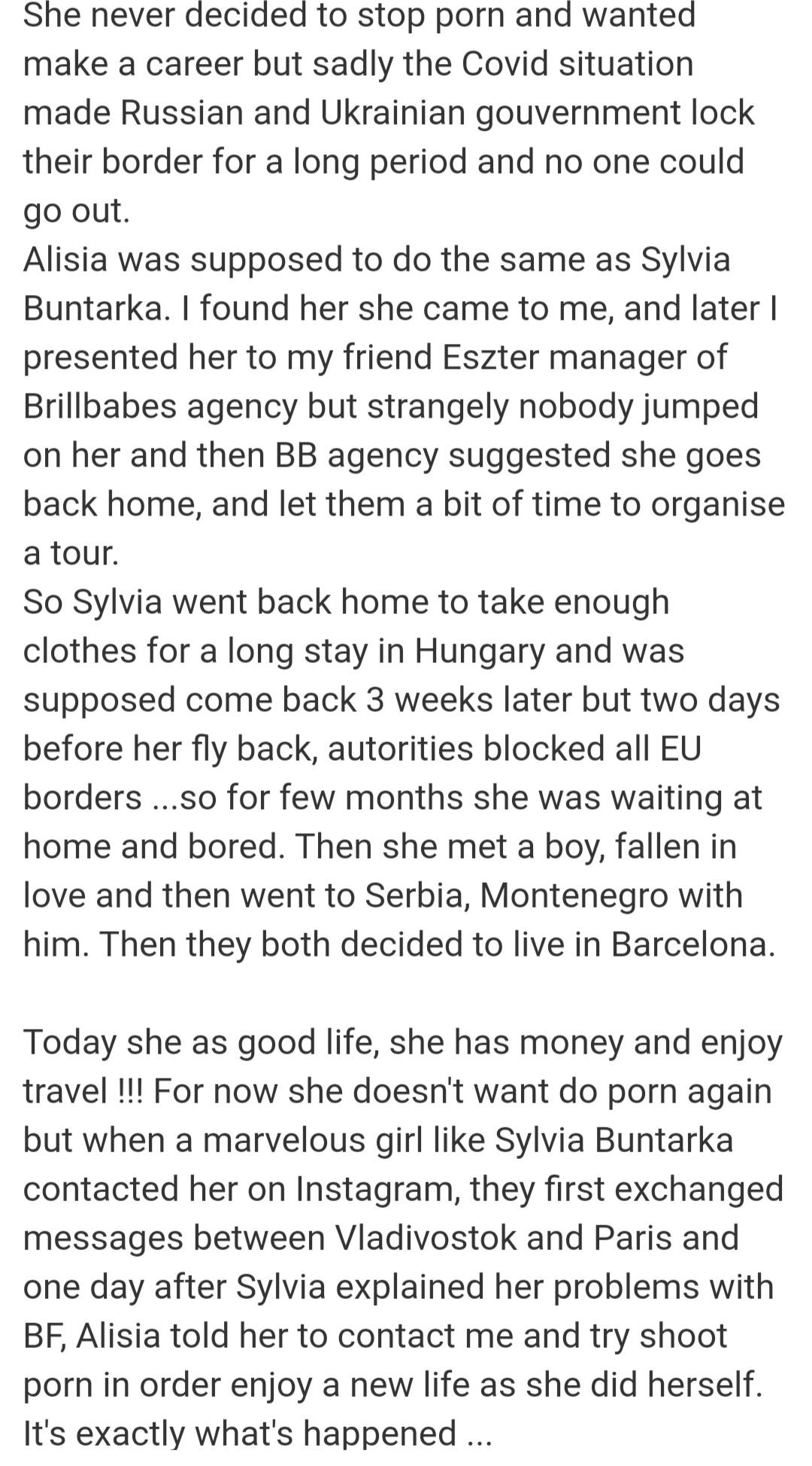 Also why would Alisia advise Sylvia she will have a great bew life if sge goes to PW? Alisia herself couldn't even kickstart her own career, made couple videos abd dusappeared from porn. So what exactly did she advise Sylvia. Stlvia just had problems with her bf so Alisia must have told her, don't worry, you will have good sex with him and firget your bf. So if she really come from a rich family, why would Alisia send her to PW? For money offcourse, not fora career or to have good time with the ape. Alisia got paid well fir an unknown girl. Nobidy knew who she was. Got a fat paycheck for her escort service and then left for good.