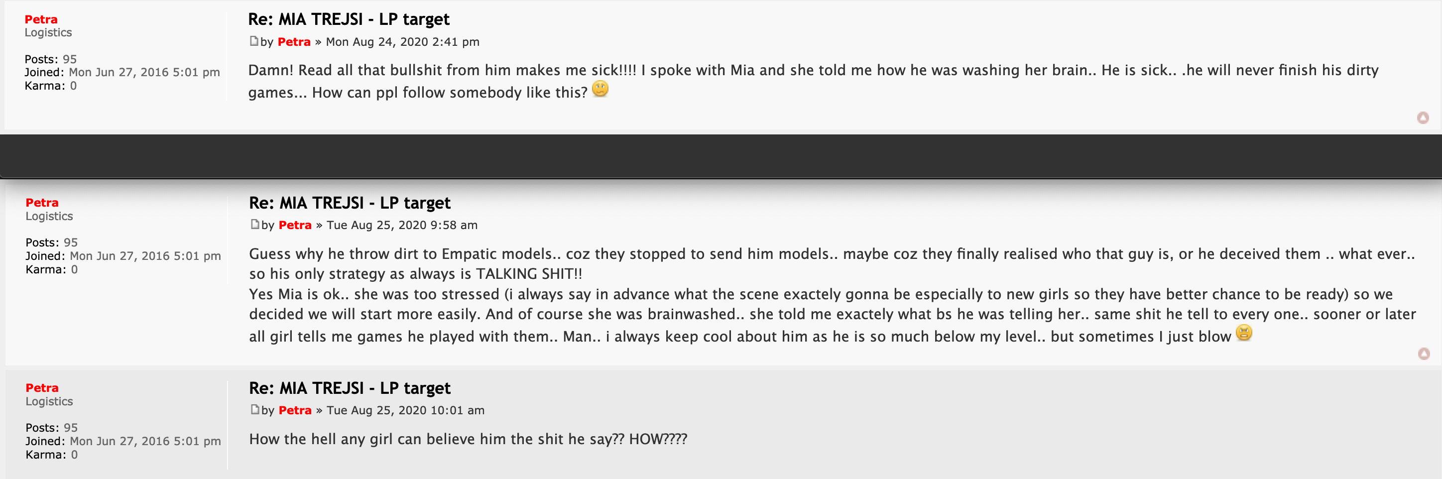 He said the same thing for Mia Trejsi (now I can't retrieve a screenshot, but what he says is there in her thread), after the casting she left her BF LOL, which is not true since she has always been with the same guy and they even have to get married (just check her IG before and after the casting)