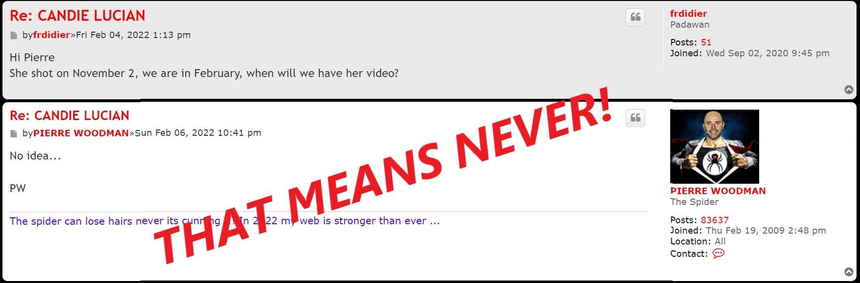 It's actually quite ironic when you think about it because all the pre-2017 castings he cannot show because of the aforementioned reasons, and all the post-2017 castings are rigged with the models being told everything that is going off. So on both accounts, Woodman is bare-faced lying to his members about every aspect of his castings and yet they still believe him!!!! (That fact also carries through with his shortchanging of members with the Buntarka casting!)