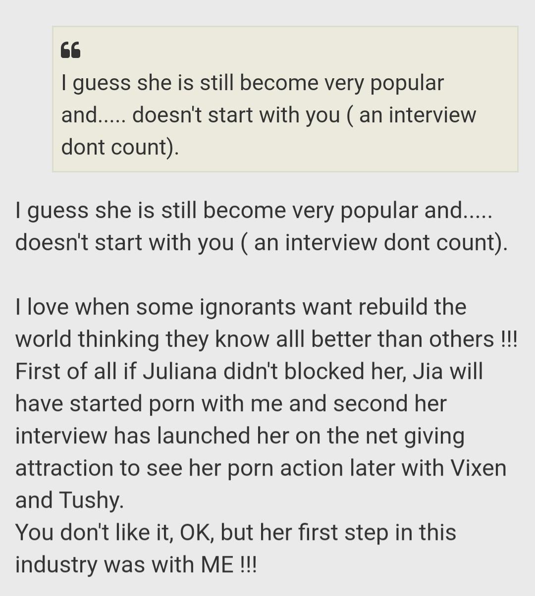 He is so delusional and bitter. It makes no sense when he says 'maybe her next step will be better and smarter' lololol wtf is this bullshit he talk. Jia Lissa already won AVN and Xbiz awards, including best female performer and best anal scene. She has hundreds of thousands of followers. I think she is more than smart to keep away from that idiot to achieve success the way she has. So what nonsense about being smarter when she's already achieved great success? What a sore loser!!! Never come across someone who has so much ego and self importance that he have to tell she started with him! So sge becane successful because of him??? She didn't even fuck with him. He's a fraudster, manipulator and liar
