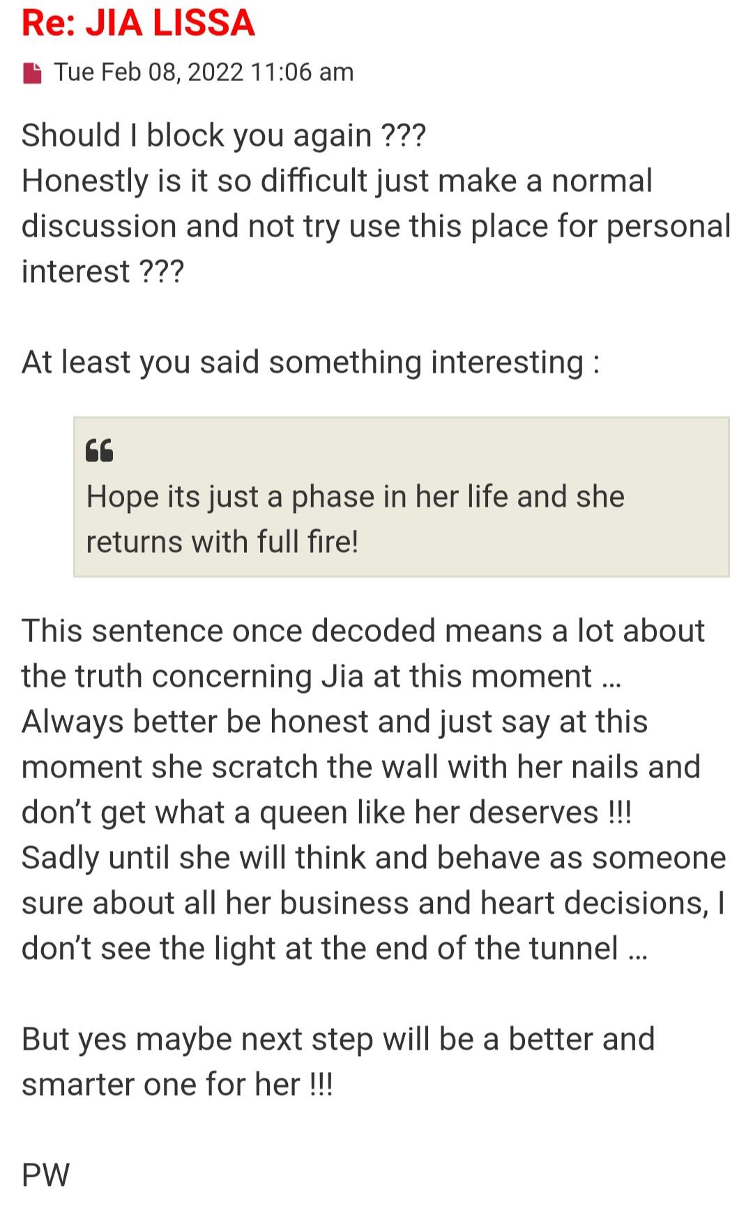 You should see he wrote a book on Jia Lissa's thread lol he clearly got triggered. His response wreaks of jeslousy. He can't stsnd that he is not as successful as his competitors. Lots of fun happening in that thread. Let me guess Indiama Bones will be the next to get the boot lolol