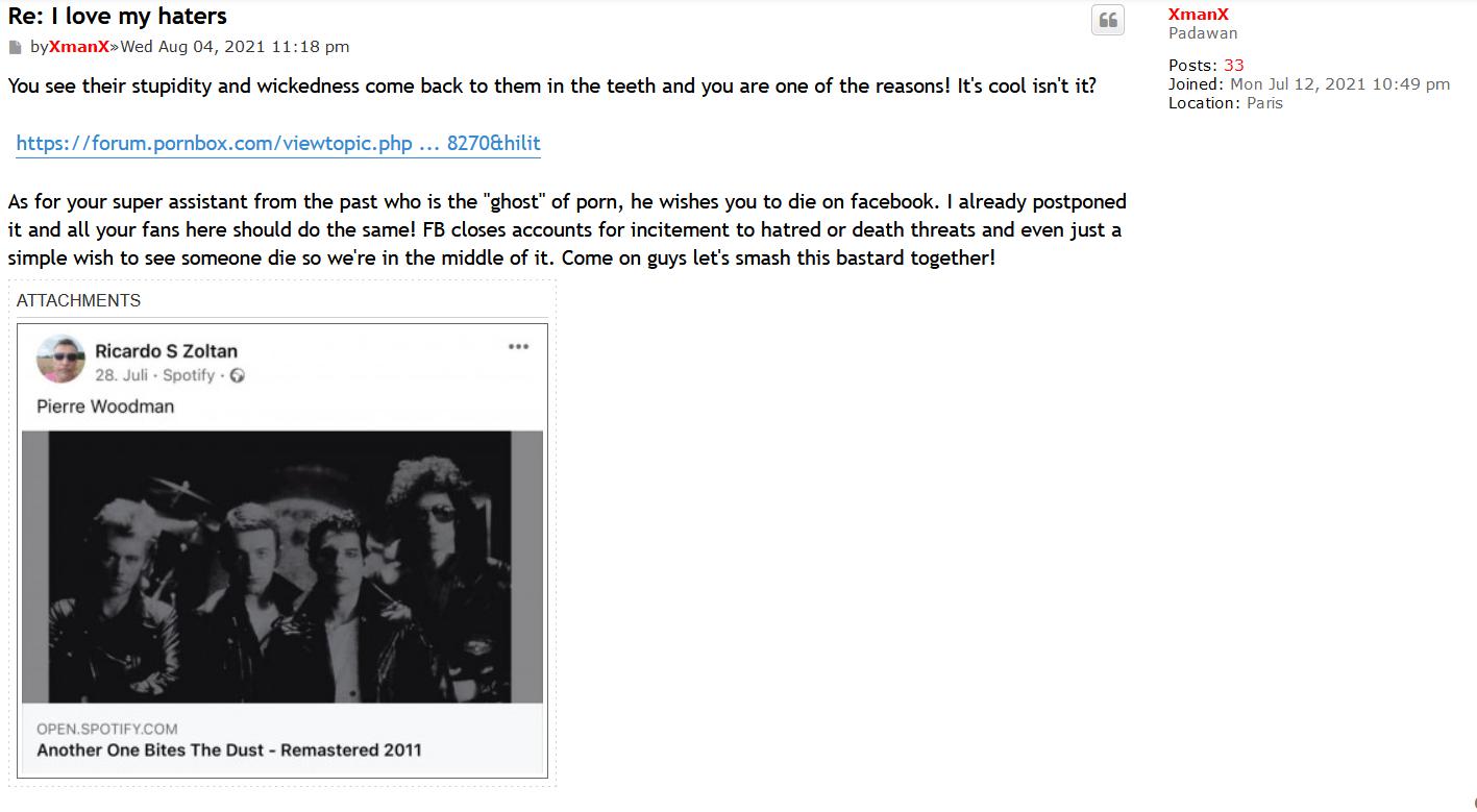 using the words "incitement to hatred" (wording used by woodman/jean on multiple occasions), trying to get members to report Soli's account for fake death threats, because he uploaded the Queen song LOL.