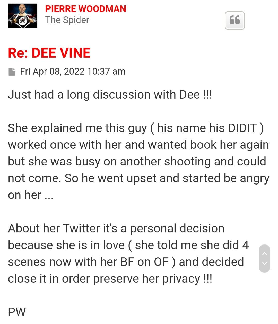 Now...about Dee Vine.. watch how Woodman gets caught in his own web of lies. The girl quits porn(funny how so many he say start with him but suddenly always quit) then she close her [spam], so PW being the paranoid ape that he is, writes on his forum that he had nothing to do with it as always. Instead he makes a lie about some photographer causing her trouble and that's the reason she stopped.
