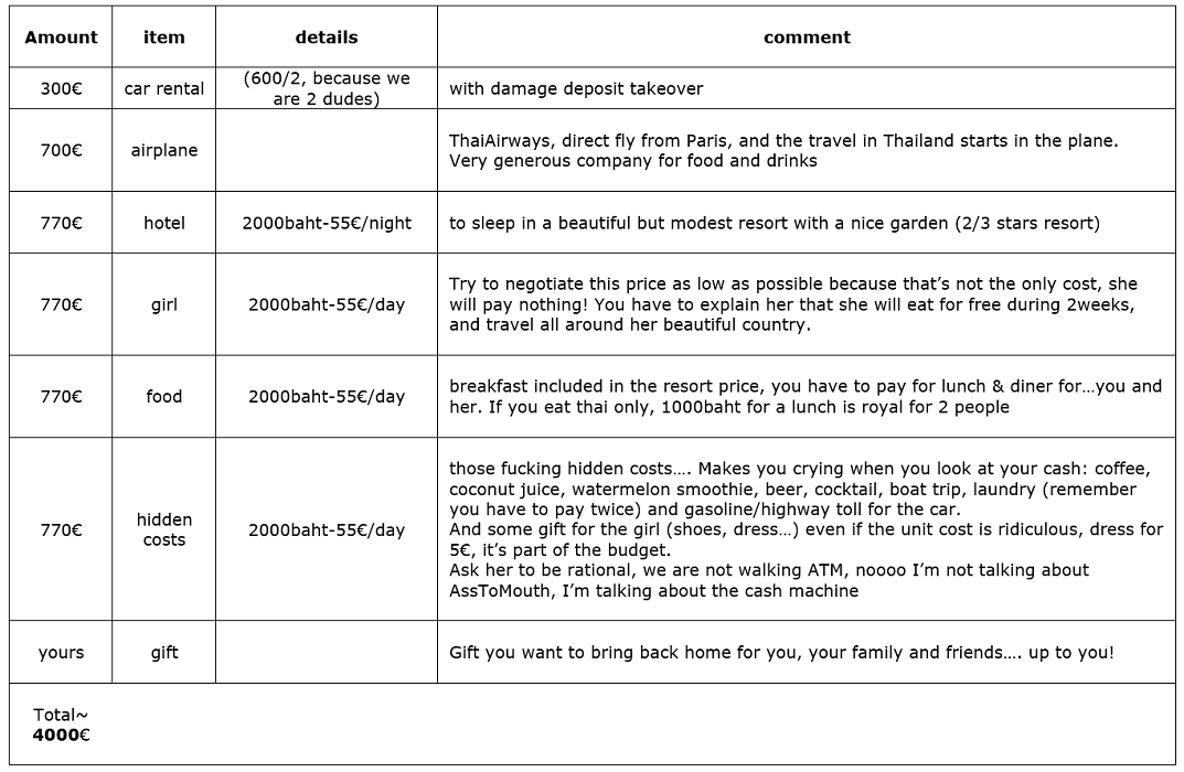 4000€ (gift excluded) is a lot of money for the majority of the people. Therefore, I can’t go in Thailand every year.