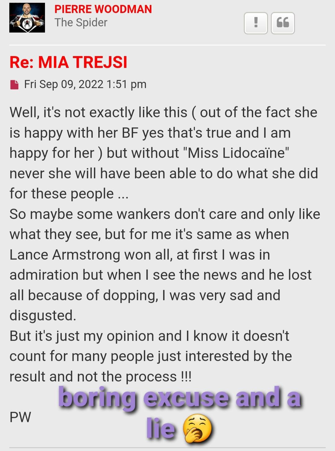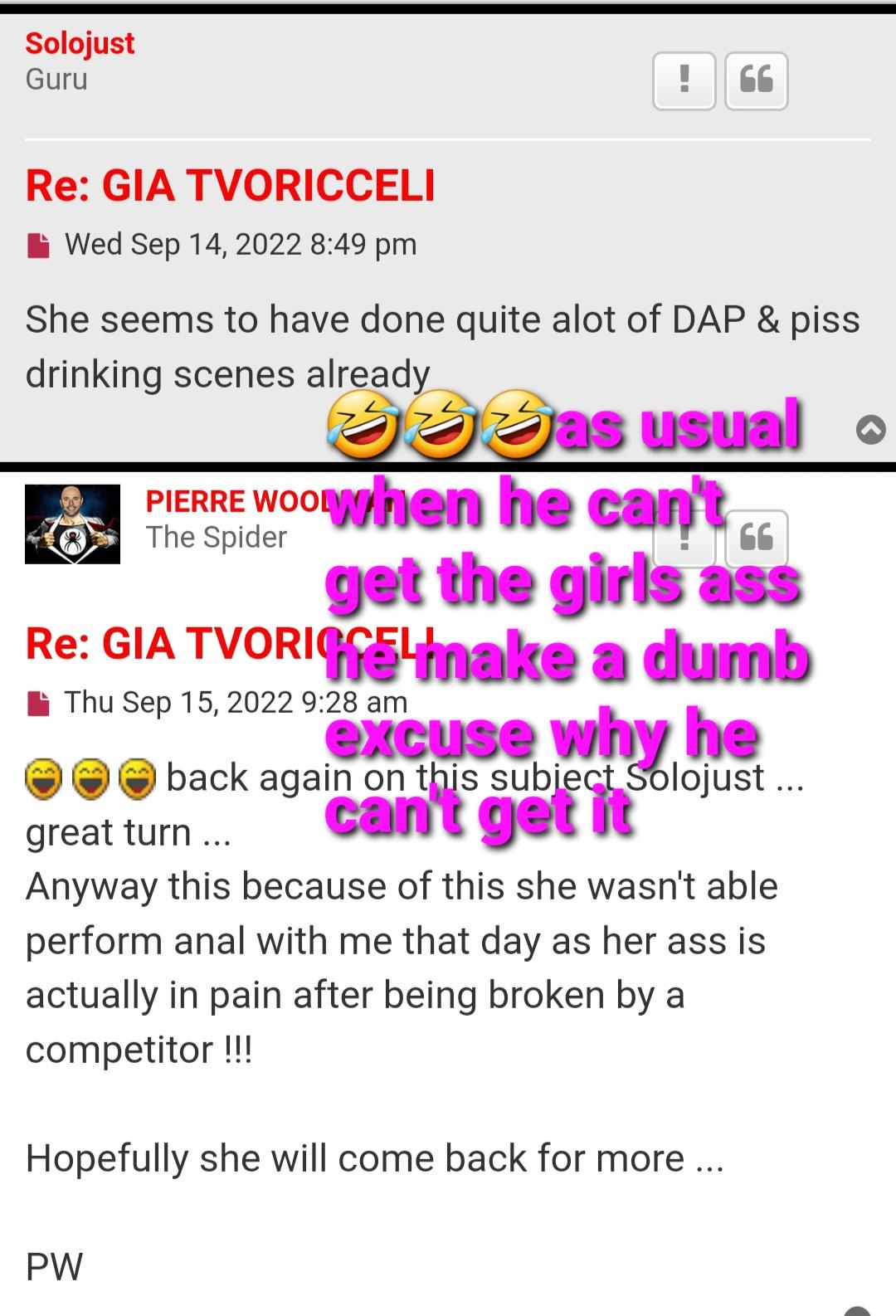 Now he is saying that he is upset because she was able to take two dicks in her ass for pornbox happily, but he struggled to make anal with her bwahahahahah. Hilarious. So much rage thay he has to make up more lies about lidocaine. He is unable to acknowledge other peoples authentic work so he has to lie. Absolutely pathetic from Woodman. I'm sure Mia Trejsi will be thrilled to hear what he said. Obviously she doesn't care and he is bitter now because she don't bother to come to him anymore. So slowly he writes with bitterness now.