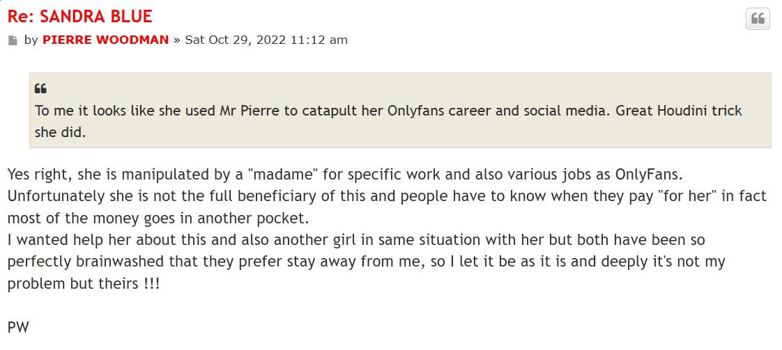 No surpise :D :D :D typical thing he does everyday on his forum writing bad publicity about models when they disappoint him. Now he talk shit about Sandra Blue lololol he is so pathetic. Check out Ruby Sim thread. No we know what we always knew, there was always a problem and he was the one who caused her mental distress. She deleted him from YW so all what I confirmed was true. So now he is so coward he has to create an alter ego to write that silly comment on her thread. Angry becauae she pretend he dont exist lolol