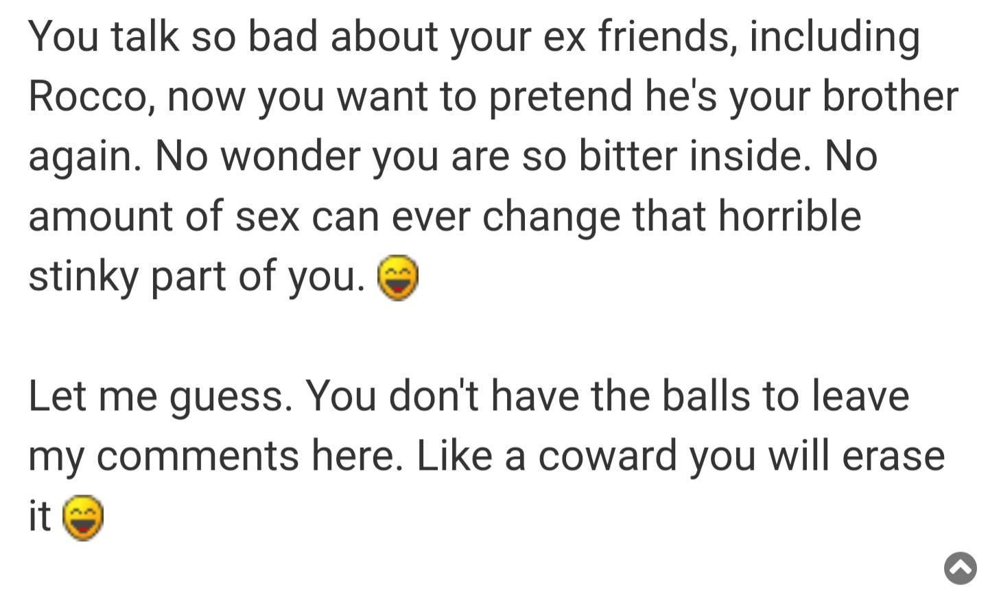 I repost the original message, the one he wrote without thinking as a good toxic narcissist with ego problems he is not emotionally mature, he is not able to regulate the emotions, escalate every conflict immediately and let his ego take over his thinking constantly.