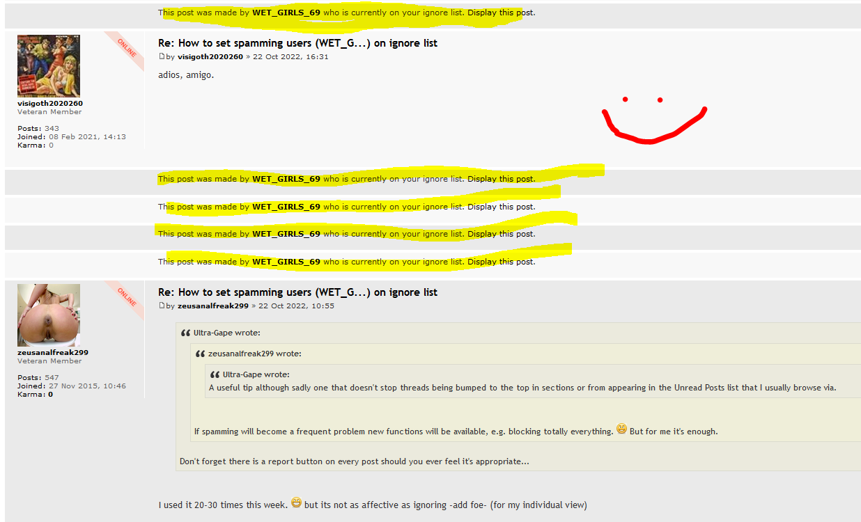 Iddaoeeok wrote:I don't agree with that method, to be honest. I've been a member of various forums over the years and I've never once blocked anyone so I can't see their posts. Even if someone's annoying I'd rather see what they're posting. If they are breaking forum rules or disrupting the forum unduly - spamming multiple threads for instance - the moderators will get round to banning them eventually. I'm not going to do their job for them!