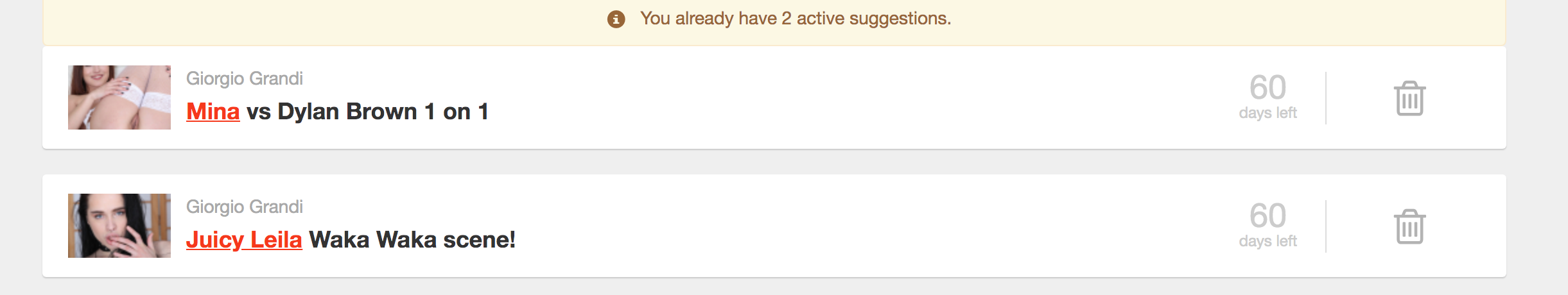 Titus1 wrote:I created a suggestion for Mina and Dylan Brown 1 on 1, I also created a suggestion for Juicy Leila Waka scene, if people here could upvote it we might get what we want, Thank you.