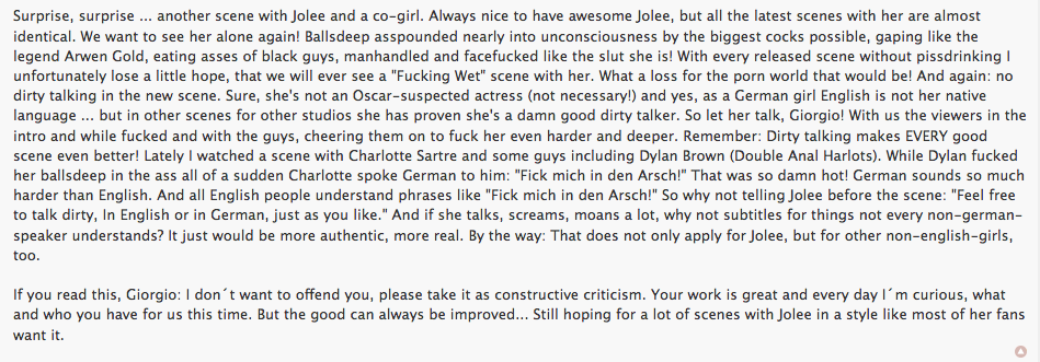 Unfortunately one of the most neglected things in Giorgio scenes. He has a tendency to turn models into "dead fish". Especiallyint two girls scenes dirty talking is an absolute must. No matter, if it's well acted or - even better - real. Recently there was a scene with the awesome Jolee Love and Selvaggia: The ONE AND ONLY sentence in the whole one hour scene was Selvaggia "Do you have something for me?" when she wants some cum in her mouth from Jolee. Sic! Some girls are so great at dirty talking (especially native english speakers). Let the talk, Giorgio! And why always these silent intros? It would be so much hotter, when the girl speaks to us viewers in the camera how she wants to be fucked hard by all the guys. And when she cheers on the guys during the scene to fuck her even harder and deeper in the ass.