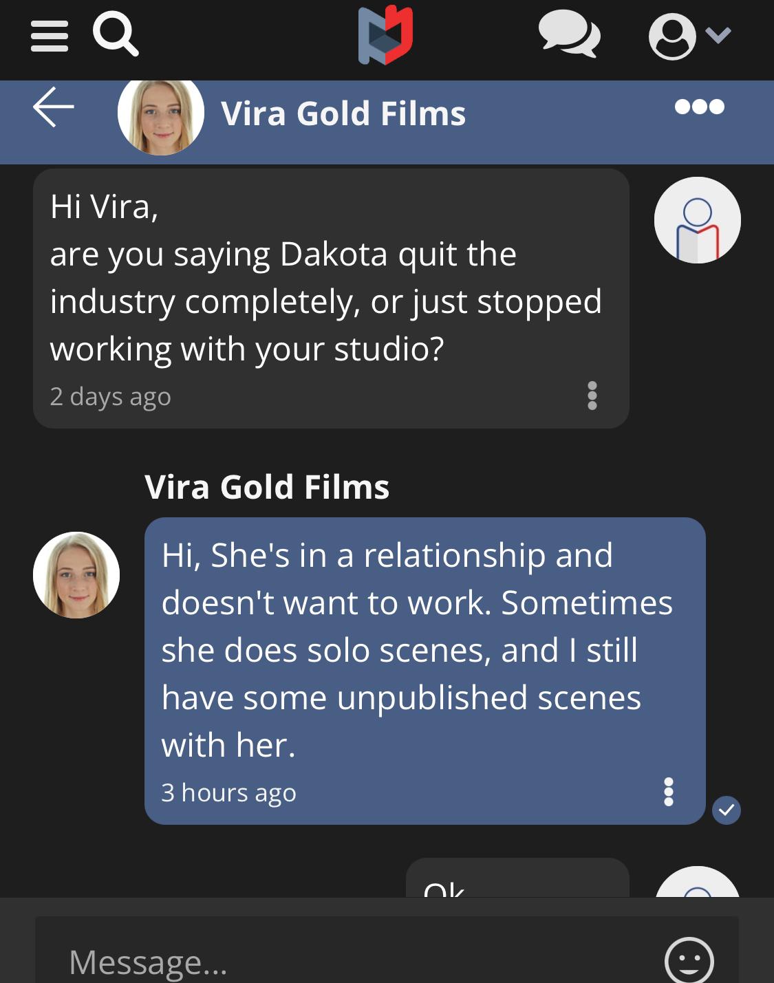 I asked VG months ago, and he told me that Dakota “is not active.” Yesterday, I followed up to clarify whether she’s retired from the industry completely or just no longer working with his studio, and I’m still waiting for his reply. ( I’d say she’s probably retired)