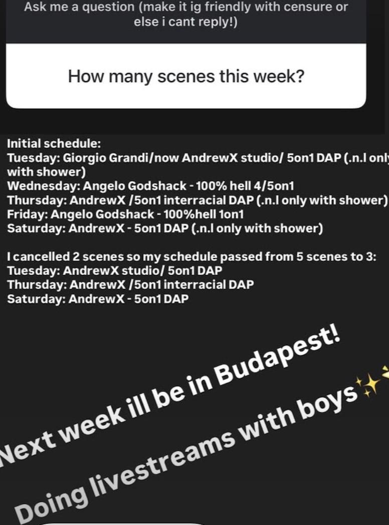 dap-addict wrote:Most girls need an anal break day after DAP, Angie Bloom is just a human like everyone else. Most important is her health! It's interesting however she cancelled her AGO scenes and no AH scenes, but again it was maybe just his bad luck that they fell into those common-sense anal break days.