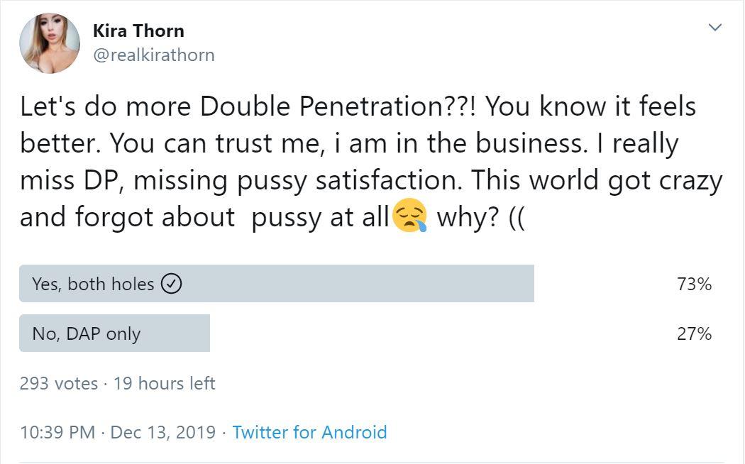 And in discussions hard time for DVP fans: Sb confessed her he hated 0% pussy "because it was "stupid" and Kira answered him:Double vaginal feels horible