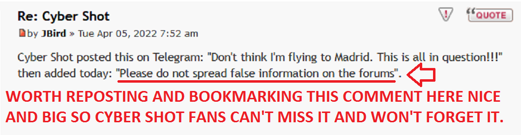YumYum74 wrote:JBird wrote:Cyber Shot posted this on Telegram: "Don't think I'm flying to Madrid. This is all in question!!!" then added today: "Please do not spread false information on the forums".