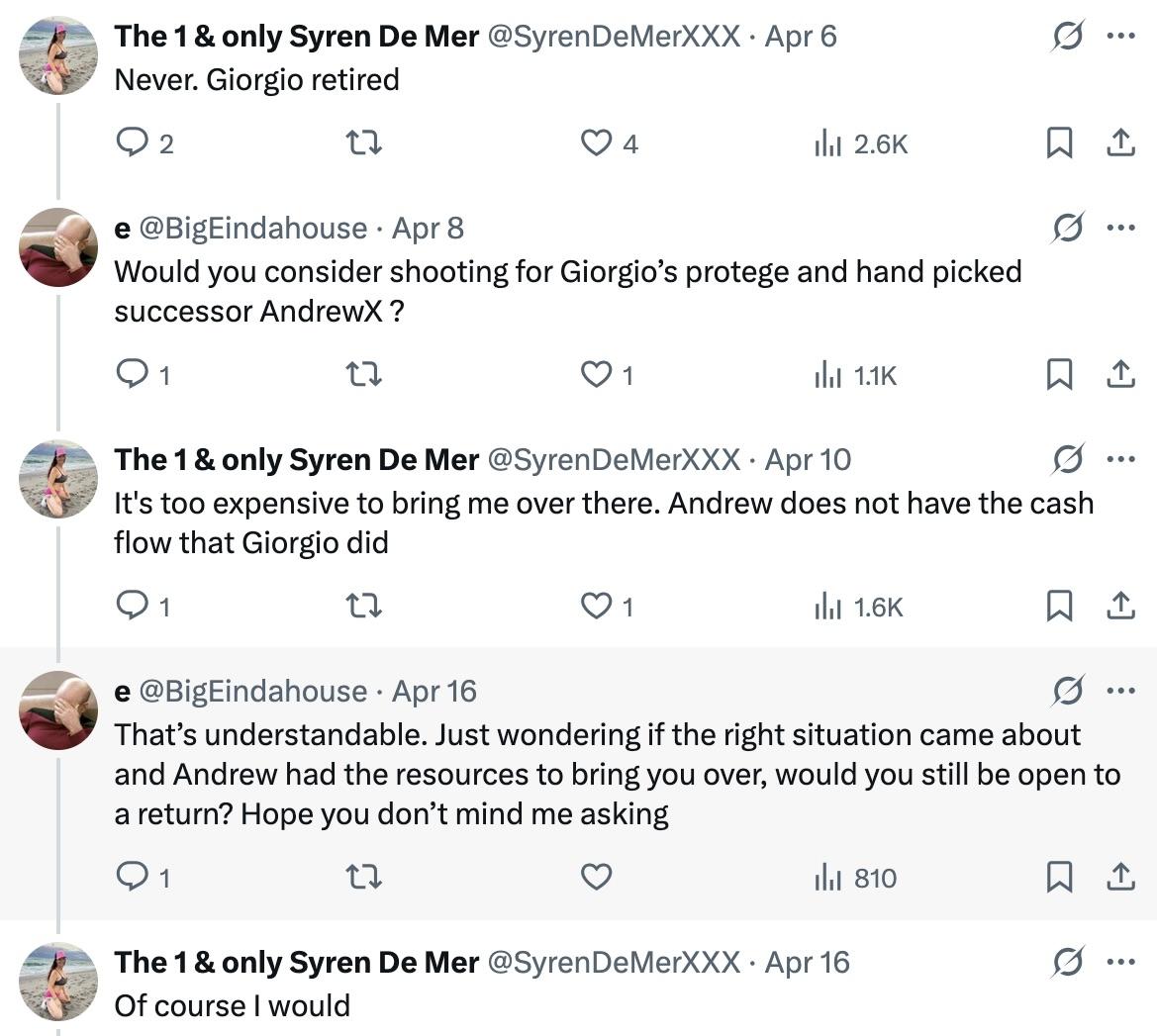 Valo597 wrote:We’re coming up on two years since our queen, the lovely Syren has been to Prague. Every week I hope to come on here and see this thread bumped with news of her return but it sadly hasn’t happened yet. It’s such a bummer cuz Syren is happy and willing to come back. And we know what more amazing scenes she can do like Gagsgirls for example. Andrew, please try and find a way to bring Syren back. We know there’s cost involved but she is the best milf performer out there and is one of the legends of LP. There’s so much more to shoot with her. We can only hope and dream and pray it happens.
