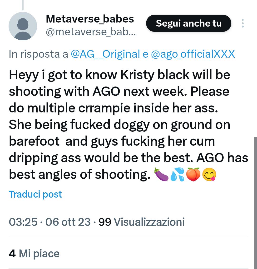 Porn Box Bot wrote:Kristy Black 5on1 Hardcore Triple penetration gangbang with pee, anal creampieStudio: Angelo Godshack OriginalRelease: 14 Oct 2023Starring: Kristy Black, Deny Lou, Brian Ragnastone, Mark Dozer, Thomas Lee, Neeo