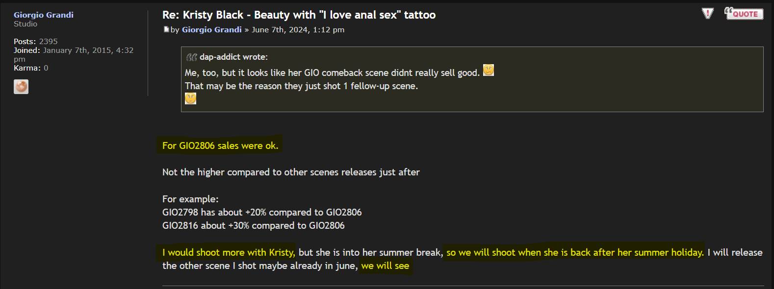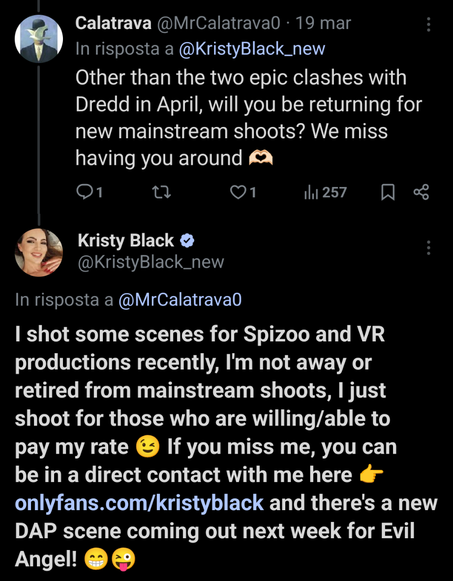 JediMasterBates wrote:Latinloverf1 wrote:Sad news, but there is speculation that Kristy Black is planning to take a porntrip across America. There we will be able to see her ass being stretched by Dredd and Mike Adriano. Doing gangbangs with the production companies GangbangCreampie, Creampiecathy and Tadpolexstudio, as well as anal BDSM scenes with the studio Kink.