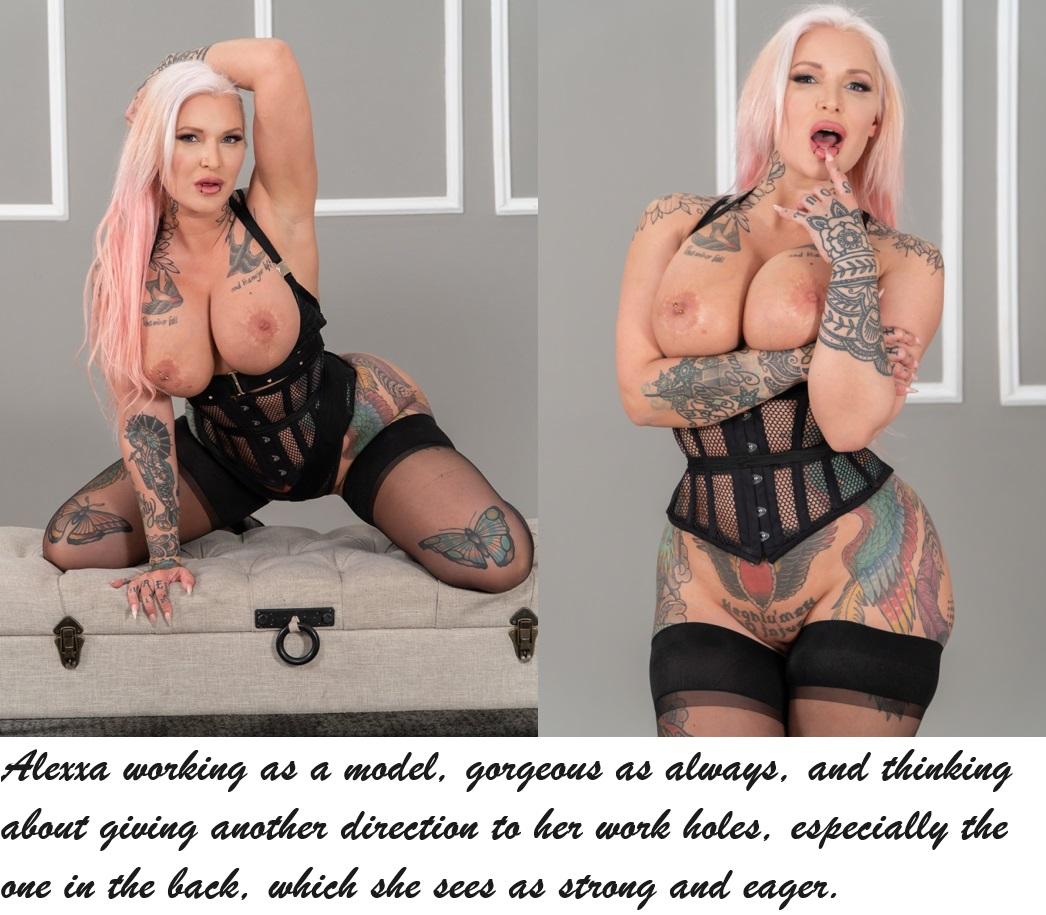She has already worked with Louise Lee before. I think Alexxa works better alone, and with a minimum of 4 males, less is a small matter for her. I think she should work completely naked, since her tattoos serve as a dress, and so we can see her beautiful entire body, from her toes to the top of her head. With clothes it distracts our vision.