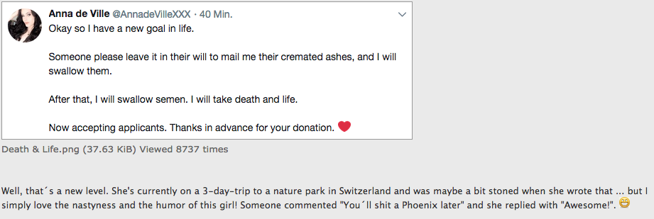 Wotan29 wrote: @dap-addict: Why did you comment "porn girls can´t feel like that and can´t wish that"? Yes, some of them can and Anna de Ville is one of those nasty girls we have to worship! She´s the perfect combination of classy and slutty, body and brain and most important: she´s a freak - meant in a positive way. She repeatedly told in in interviews and tweets, that she only watches non-consensual porn scenarios in private life. So why are you surprised and don´t believe her desire for being treated like in this scene, dap-addict? And do you remember this tweet: