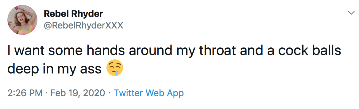Rebel Rhyder? ?@RebelRhyderXXX April 18 2020 wrote:Slap my face, spit on me, choke me, pull my hair...use me like the slut I am, and I promise I will be smiling after. Nothing makes me happier than being used