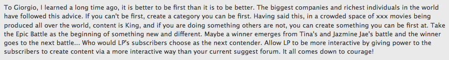 It's great that you like the idea of a competition scene with Jasmine Jae - and even already suggested this to Giorgio.