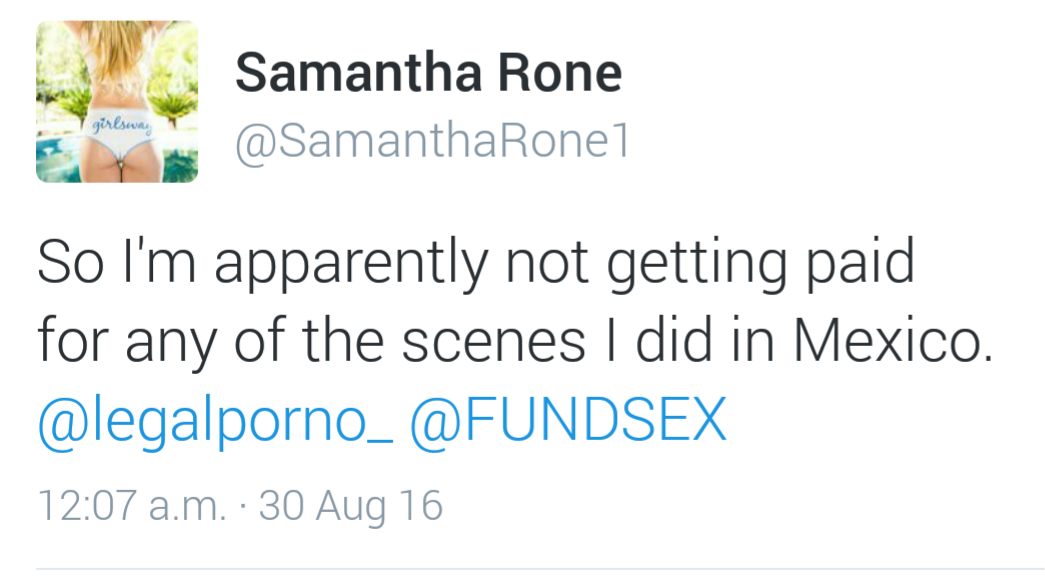 Samantha Rone @SamanthaRone1 wrote:Did my first DAP for Sineplex for @legal_porno and they are refusing to pay me my rate!!! #NoPay4Sineplex Javier Vazquez is refusing to pay.
