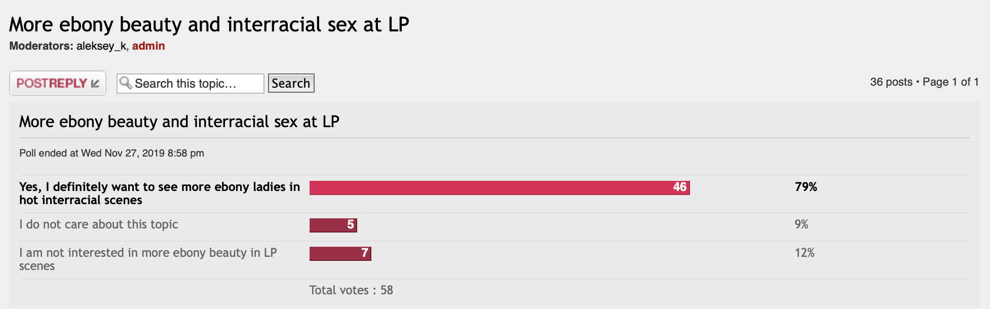 Just to let you know: I just started a poll on "More ebony beauty and interracial porn at LP (see https://www.legalporno.com/forum/viewtopic.php?f=96&t=23484.