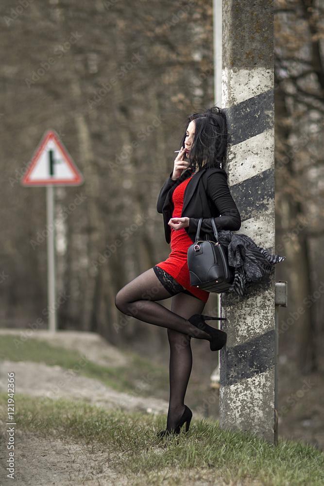 a black or red mini-micro skirt oor dress (skin tight and stretchy, eg. spandex, pvc, latex), with a skirt that always ends before the stockings start so there is always some naked thigh on display (naked thigh and a glimpse of cleavage are the prositutue's equivalent of the taxi's 'for hire' sign)