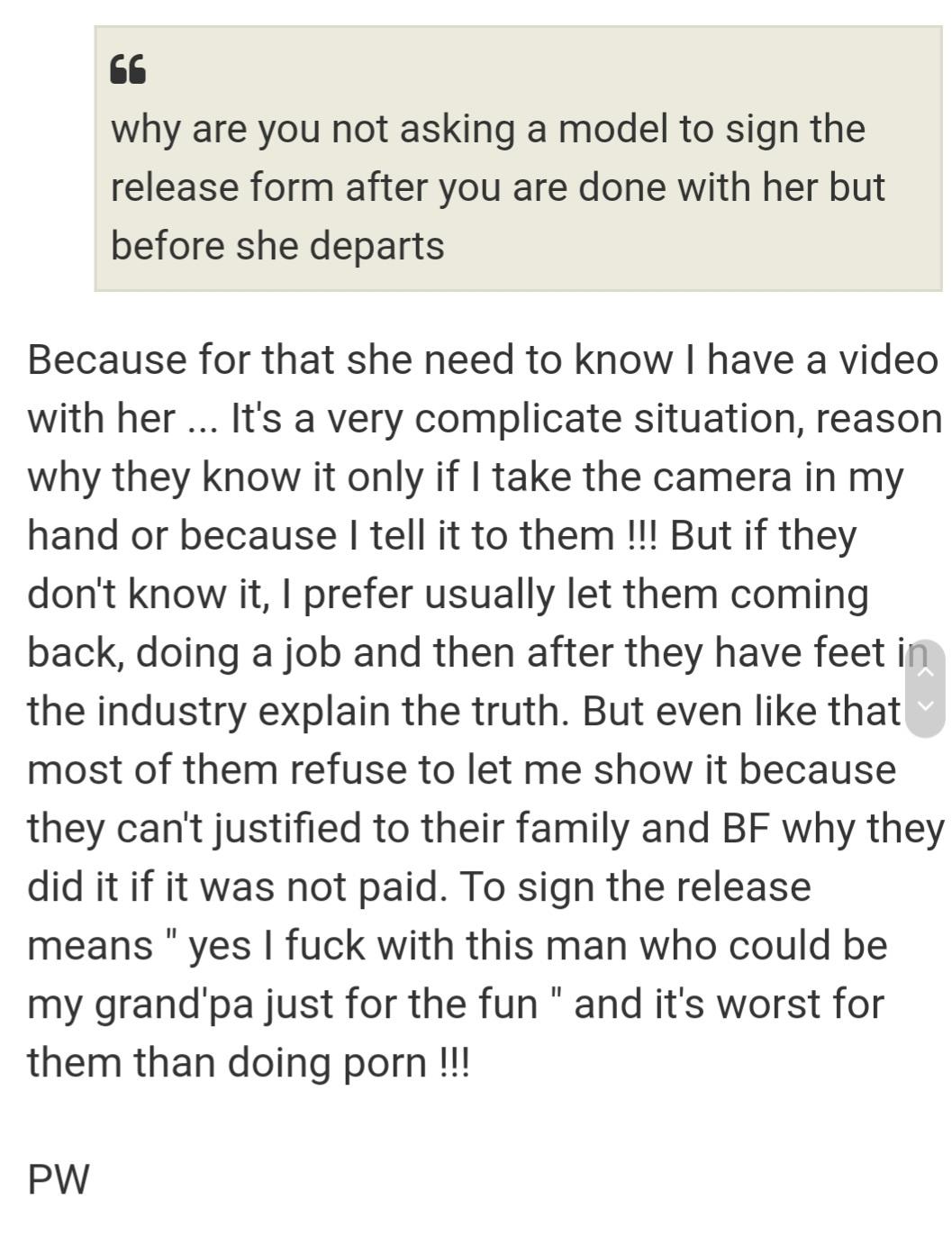 I actually believe that he used to operate like this, filming the girls and then telling them only later. However, I thought he told them immediately after their "initiation" and not after 'x' amount of time. But this does make sense as he often talked about some of the women not being happy when they eventually found out that they'd been filmed. I don't think he does this today (2016ish onwards) following all the accusations and controversies, and instead has to film everything so that he can't get his ass sued. But, here there's a problem. 1) He's now either lying to his fans saying the girls still do not know they are being filmed (when in fact they do know) Which would kind of kill claim that his movies are completely natural. Or 2) He is lying to the girls telling them that everything is being filmed when in actual fact it isn't! Could be interesting to see if he publishes the entire Liz Rainbow movie without cuts in filming as MaximumPayne requested to prove his innocence at the beginning of September as he promised.