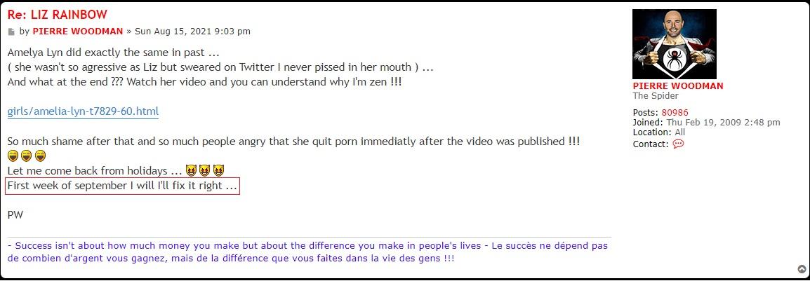 I like how this narcissistic egomaniac says about the extra private time he had with Emma Hix. Oh sure... because you think you are God with special powers over everyone else. We know why you always cutting videos.Its when you do somwthing wrong or not allowed is when you cut. We already know about your fake piss and Liz Rainbow how you make the cuts . What a contrast when says how he basically had more sex with Emma because she enjoyed, yet scroll up and you can already see the screenshots of my conversation with Emma. He violated this girl.I wonder what PW will have to say about this. Don't worry, there will be more fireworks coming in Emma Hix thread coming soon .Then there will be nowhere for him to hide. He will probably lock her thread soon like he did with Liz Rainbows. When he can't handle the heat he starts to panic.