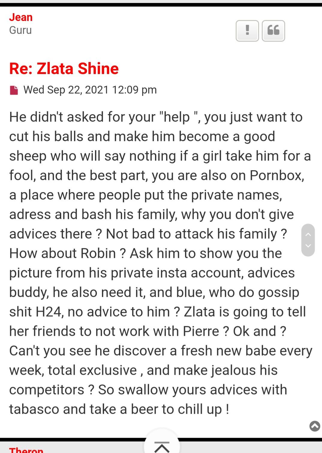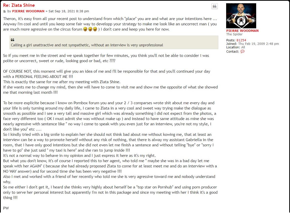 Well this Theron character is really providing some valid points and entertainment lol and it's so funny to always see PW being so defensive and to blame pornbox forum for his own mishaps. Blaming other people and forum when his own members are questioning his ethics. It becomes the fault of other. Never him!!! He should take responsibility and say yes I am wrong! But never ever because he has so much ego and bitterness. Talking so bad things about Zlata looks because she refuse to work with him. I wonder what his wife Sophie thinks about this bad ubprofessional man who slanders all the models who don't work for him. Show some respect to models you idiot! I know you are reading this! But you are incapable of being good and treating others with respect. You are nithing but a con artist who puts an act to make it seem to everyone you are good but everyone knows what a jerk you are. No wonder they don't want to work for you. Zlata is probably sipping cocktails on a beach thinking Wow. I dodged a fucking bullet. This man don't know me and he is losing his mind because he couldn't fuck my ass and I wouldn't let him lol. PW the egomaniac who can't take no for answer. You are not GOD Woodman!!! You're a low end producer who van't even get an award and you tell models its you who can make them famous. Bigfest joke of the century. Try getting an award first. You are nobody in this industry. Brillbabes just send you the girls, you pay them riches and then you pick them from airport showing your videos of you picking them up from airport and taking them to restaurant like you are a big professional man in this industry. You don't even have enough followers on [spam] and your models don't even retweet your own scenes lmao that will tell you something. Maybe take a girl to a nice location with nice lighting and have proper camera skills instead of taking them to a pathetic, delapidated hotel room to do a casting, and fuck them with your outdated handcam. Such a poor production and you wonder why you can't win awards. Your video quality sucks!!! Everyone knows you are the Harbey Weinstein of this business and you will get what is coming to you one day. Many many girls hate you amd stay away from you because they already know about your devious ways. Deep down you know yourself that you are a bad man and a fraud. Your own members giving you advice which you can't even take with a pinch of salt because your ego is bigger than your brain. Quite frankly I don't blame any of these girls talking shit about you because you are far worse!!! And you are si stuoid you do it on your own forum where your members pick it up.