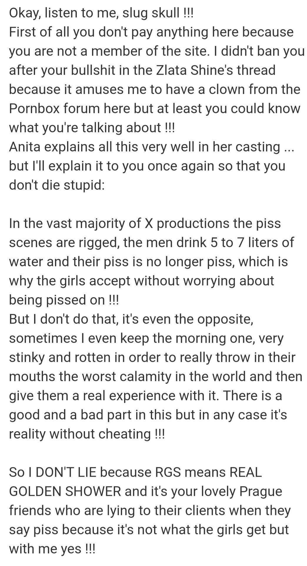 "Nice find..."ValenciaCF wrote:Well he will never show any evidence of Liz Rainbow because there is no evidence. He was supposed to do it after holidays but it was all a lie. Don't take a rocket scientist to know that. All he had to do was post the video to prove it, but he posted an edited pic instead and he calls it proof lol nobody care about your fake pics. Put the video online and show everyone! He can't do it and he was feeling "nervous" which is why he locked the thread just like he did Zlata now. While very few of his RGS is "real" you can clearly make out a fake scene from a real one. A real scene there is no "cuts" the video plays entirely. You can clearly see Liz Rainbow and many other scenes how he make his "special effect" edit for the piss part not shweing how he is pissing in her mouth and he think we are fucking stupid lol Why he don't put the whole video??? Because he's fucking lying plain and simple. So this Liz Rainbow evidence he promised will not happen because all know PW doesn't know what a promise is. He lies to everyone.