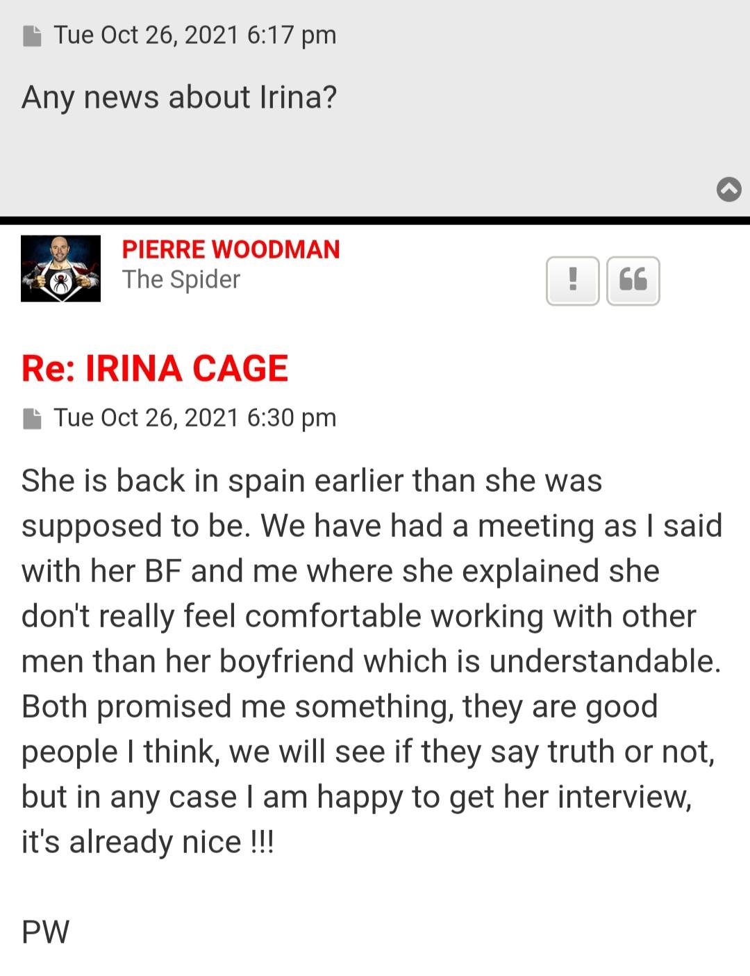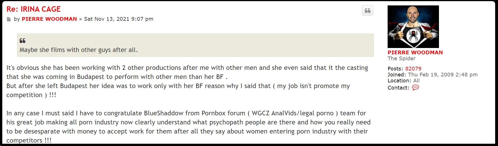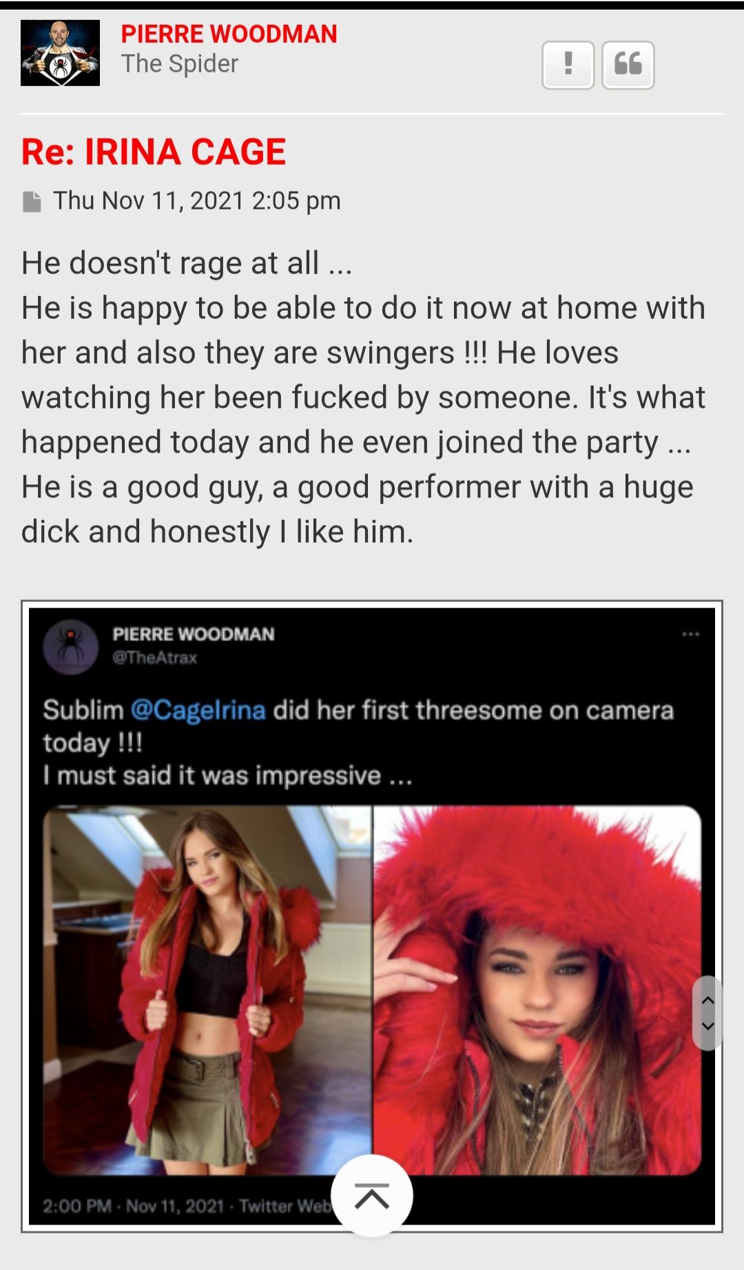 What is your problem is your brain so damaged that you can't understand when she replied even personally to you that she didn't receive any piss from this asshole woodman? I had listened very carefully to this part of this scene and if you are a good listener enough you can hear she was really surprised looking by her face that he asked about PISS! AND THEN SHE DIDNT SAY YES OR NOT SHE WAS JUST BLOWING HIM AND THEN SHE KIND OF JOKED that maybe she would do it one day if she has a chance - even in the casting she was talking sarcastically to him its more than CLEAR THAT PW DIDNT DO ANY PISS WITH HER OR DID HE? SO WHY IS NOT ONLINE? BECAUSE NOTHING LIKE THAT HAPPENED and calling her skank on her thread is so disrespectful and offensive toward her I dont know why you are so mean to her if before that you were speaking good about her. YOU REALIZED YOU WILL NEVER GET SO BEAUTIFUL AND CLEVER WOMAN LIKE HER so you have to talk shit about her to feel better with herself. See how many fans are with her and everyone can see you and valencia are the only ones against her and talking about something that never happened. Even WOODMAN EXPLAINED IT SO WE CAN SEE NOW EVERYTHING CLEAR AND IN THIS CASE NO ONE LIED. I UNDERSTAND that you are searching for material to criticize woodman and you can do it but sorry if the model and even woodman told it was HIS MISTAKE then you should just say OK SORRY THANK YOU FOR EXPLAINING but no! We can see you just want to believe that he pissed in her mouth because it makes you feel more comfortable but deep inside you know it is not true. GO and see even her casting with him when she points out very clearly in detailed way. Now you are doing the same with Irina CAGE do you really enjoy harassing the girls for your pleasure? I dont know how they still didn't ban your account