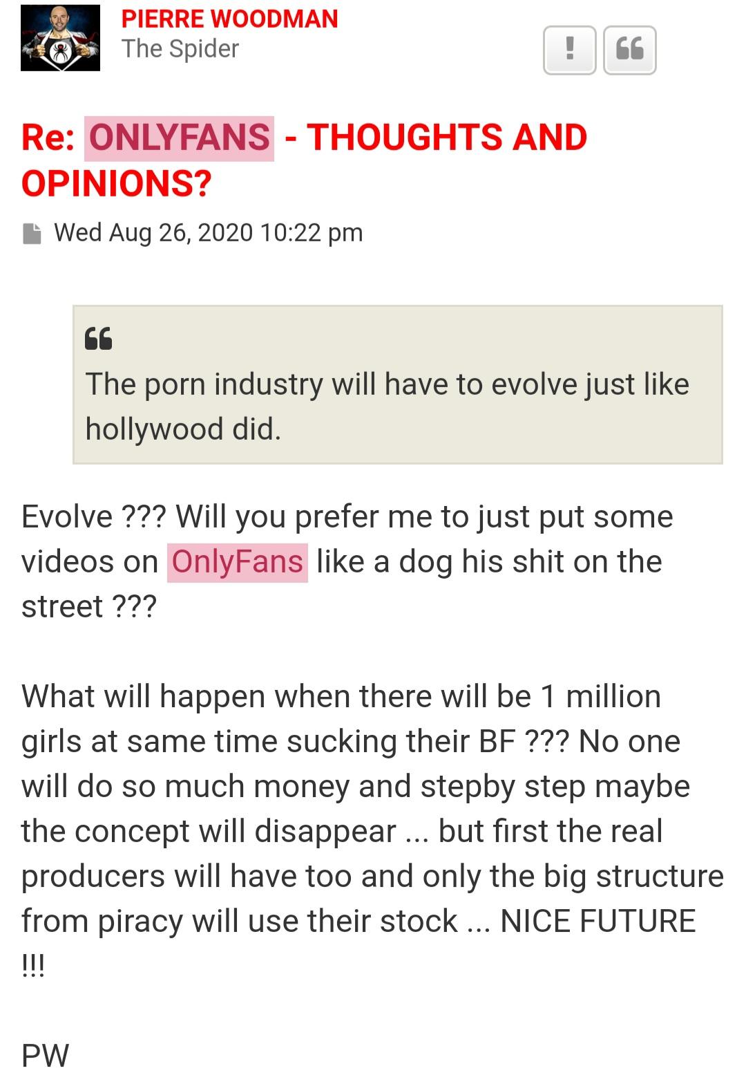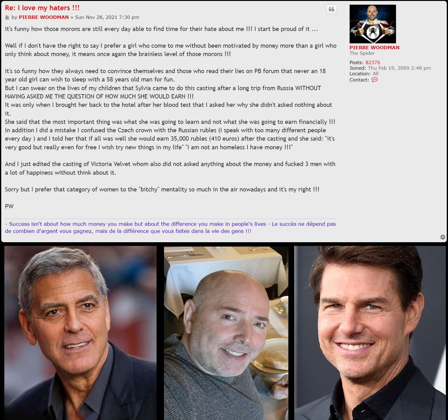 Tom Cruise and George Clooney lol that was a good one. Yeah it make sense if it was them. They are good looking guys and young hearthrobs the women still like now they are old. But Pierre Woodman??? I fall off my chair he is a big humpty dumpty looking man you think these hot girls will sleep with him for fun or for money. Obviously money. Common sense says they can have fun with anyone so he can pretend and bluff that he is some kind of Casanova, meanwhile he lies and have big ego. He has beem exposed lying so many times and remember whem he lied he didn't boot Orgazmo from the forum amd he came back to say PW lied. So he gets caught always in his owm web of lies and the best thing about it is we don't really need to show thst he is a bad man, because he does it himself. Already all the proof is here what he says and does and all shady things. He is a rotten soul with a black heart,pretending to care for models but only caring for himself and his own business. Selfish, self absorbed man obsessed about talking about himself because nobody else does and when 1 girl out of 1000 girls post a nice message about him on [spam], he will quickly screenshot it and try amd convince people "oh look how kind amd nice she is" because she write nice things about me. Only a fragile man does that. His reputation is dog shit, he csn't convince people otherwise. Especially with all the dirt he covered himself with. So all these models need to wake up amd smell the coffee. This man is not a good man at all.