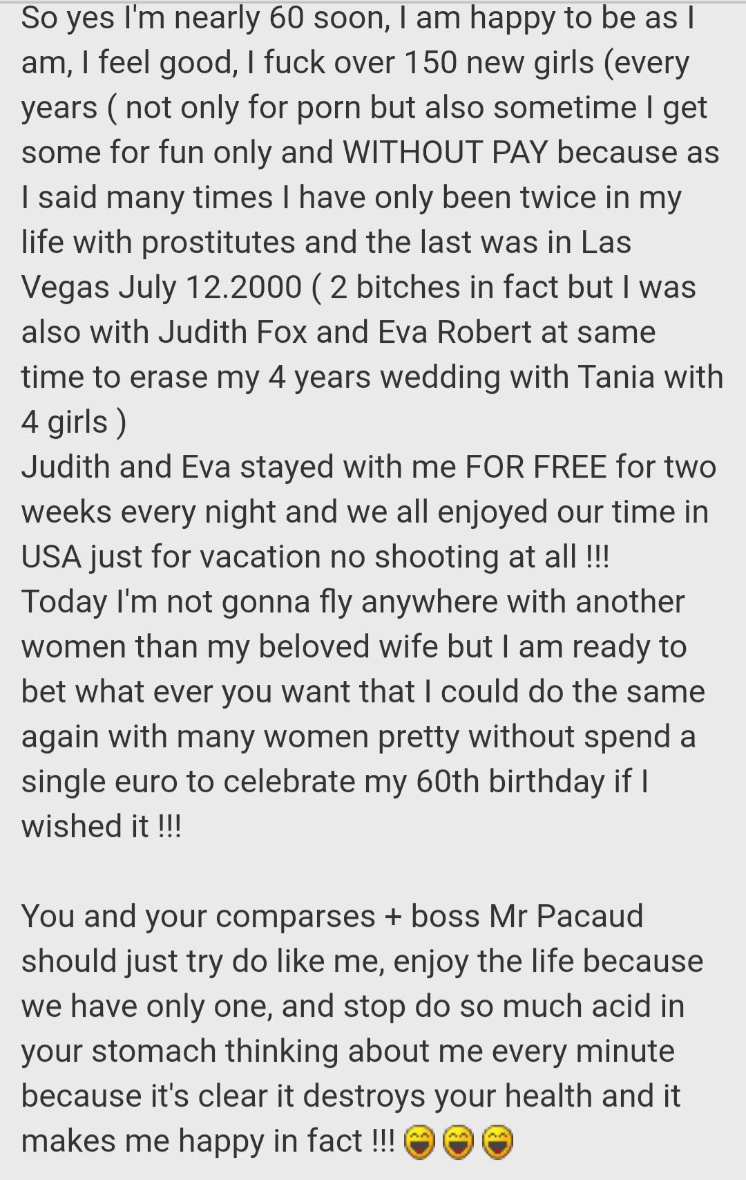 Well I am glad that he could not resist but to send a big post to try and defend himself because it shows how threatened he is and he have to keep his ego in tact. Like I said it's him who make himself look stupid now admitting that he has paid for prostitutes before and even Judith fox who he can talk alot of shit about now after she asked him to organise rape scene for her. Offcourse he also could not resist the temptation to talk shit about Tom cruise and George Clooney either lol telling they had surgery and he didn't. Because it's what he does.He like to make other people feel small amd himself like a King. He basks in his own self absorbed pathetic illusion of being better than everyone else. I suggest he focus on sorting his own erection problems because his cock can barely even get hard in his own videos. He can tell he have young girls sending him messages to fuck everyday but it's all lies and words. Because that's all he does is talk words and no action. Prove it then! Show your messages, just like you were going to show the Liz Rainbow proof when you got scared and locked the thread and showed nothing. You are worst than a woman thst can only habe big mouth amd no action. You are nothing but a coward. So yeah talk about how you fucked Judith the escort for free because you think people actually believe you. You fucked her ,paid her and called her "trash" because it's how you treat and disrespect girls and escorts. Nothing new.