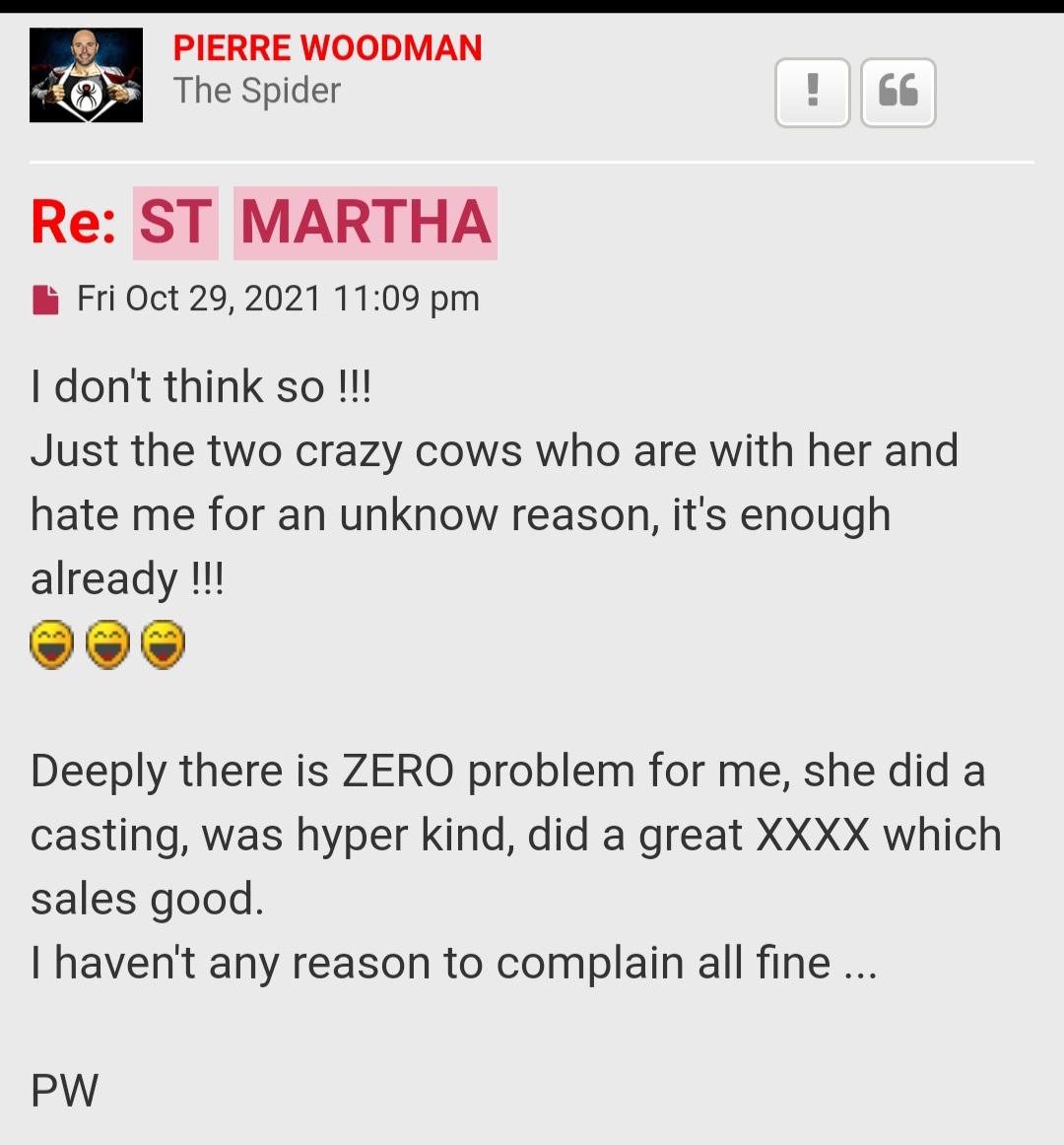 I believe you 100% because here he is telling how he gave extra money to St Martha when she worked for him and she had come back to return the money then all of a sudden his relationship with her changed. Typical Woodman. He suggested her 2 friends Zlata Shine and Anastasia Ocean told her to do it and then he went on to call them "cows" thats how much respect he has for girls. Girls he never worked with or had an interview with but he have such big mouth and so rude to them. He is a bitter,jelaous pig, rotten to the core.