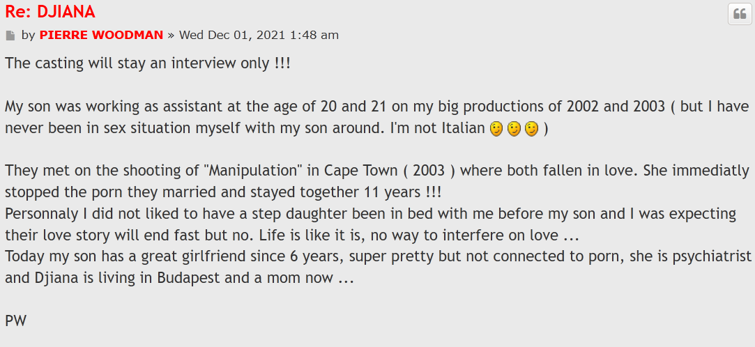 Djiana was the ex wife of Woodman's son. She was also a woodman girl. Now out of respect for his own son, I'm sure as a father he would not publish any videos of his son's wife on porn website.
