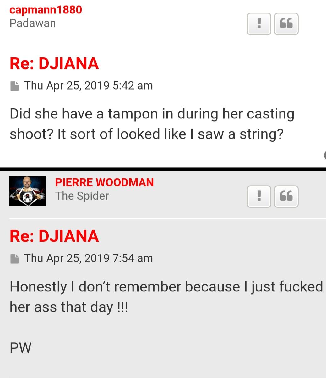 PS : there are still videos of Djiana on the website but PW had fucked his own son's wife in her ass and this is the only video he hasn't released because he says it's out of respect and she was family.