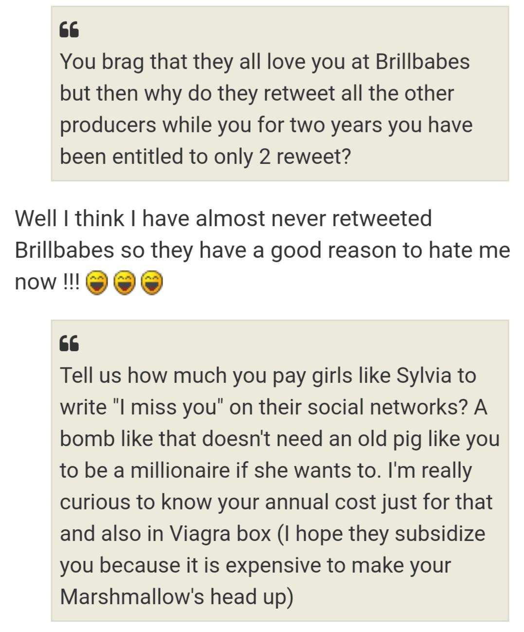 To top it off he takes a piss on Brillbabes by saying he doesn't ever retweet their stuff and laughs at them, but then proceeds to say his friendship is better than ever. What a lunatic lmao. I'm sure Brillbabes feel the same after reading that hahahaha