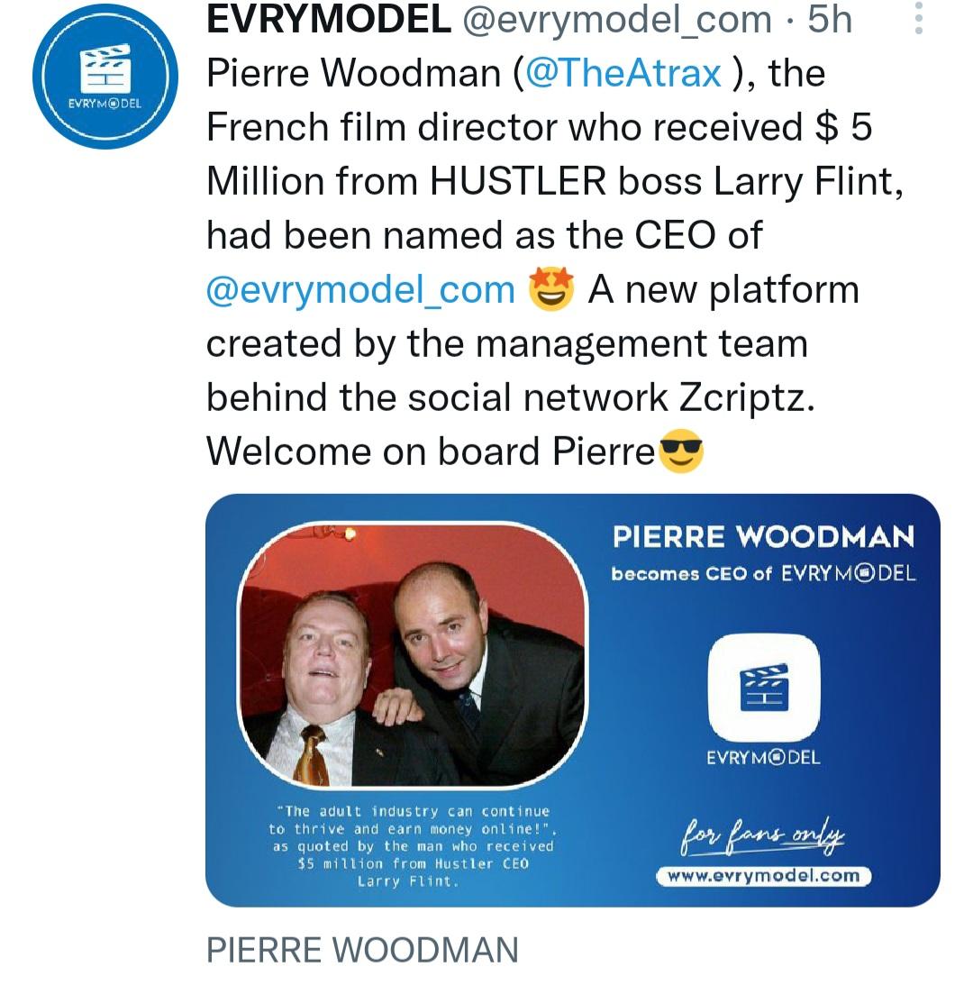 So I have just saw on his [spam] that he is CEO now of some company. Which explains his jab against brillbabes not long ago. In other words he will now brag he don't need them because he will have this new scout girl to bring him the girls. Almost like a pimp. There is this new thing called evrymodel and if I understand it correctly it is another version of [spam] but without consequences of shutting down since its for adult content. So I would just like to confirm what I said before that PW is a big hypocrite and he will always do what benefits himself and his business, as long as money goes in his pocket. Not along ago he trashed the [spam] platform because he said it was ruining the business for producers, and yet here he is now CEO of a similar platform and endorsing it. How he changed his mind so quick to supoort such a platform he was dirmly against. Hypocrisy at it's finest. Just as long as money goes into his pocket forgetting what he said earlier. Offcourse he forgot to say he got his $5million dollars from Larry years ago also.