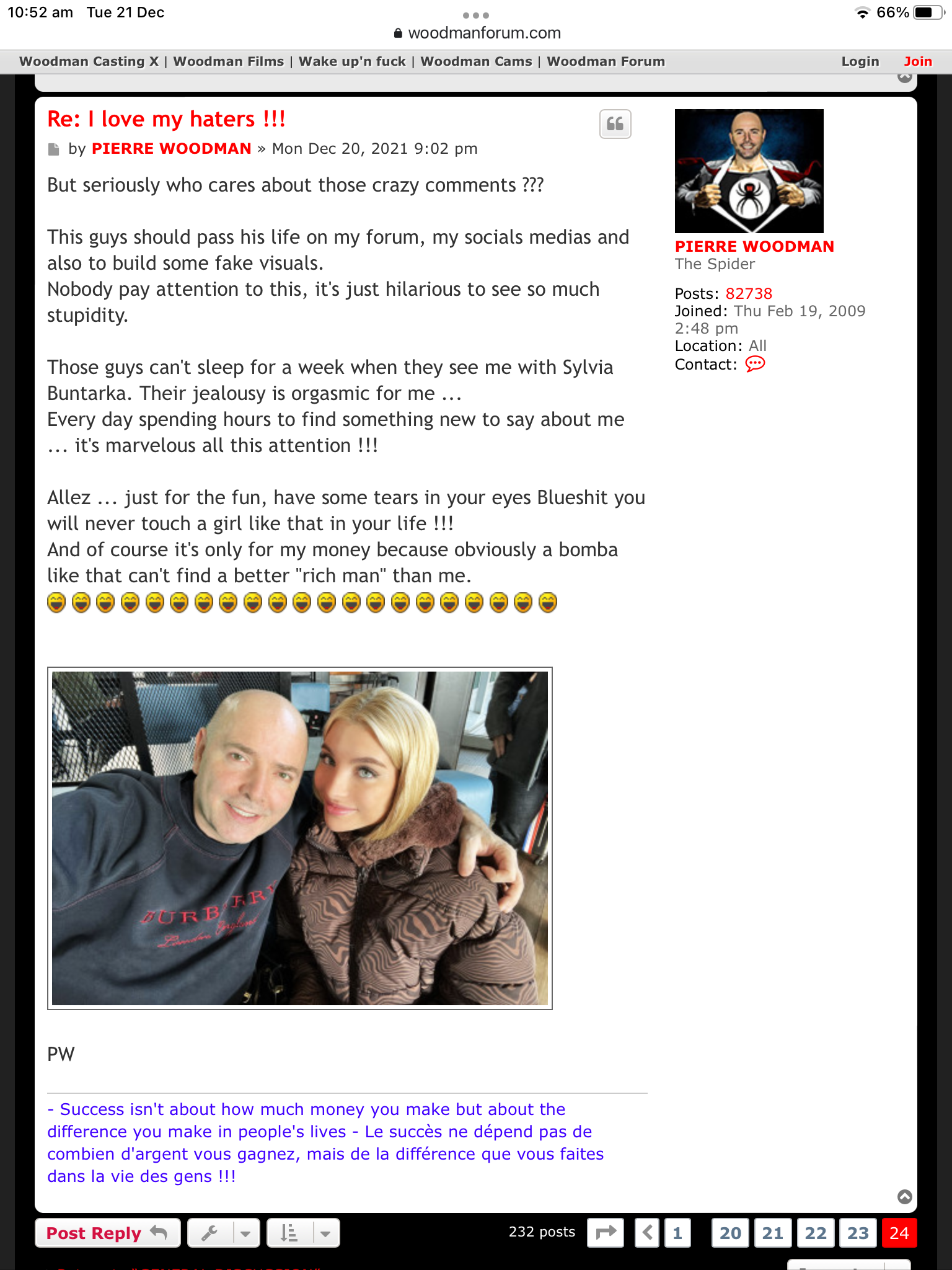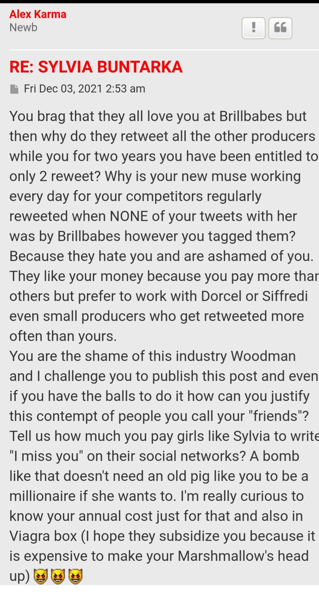 Grow up Woodman, you're 58 for crying out loud not 8! Just because people don't believe the lies you come out with doesn't give you the right to condemn an entire board...... Especially when they're right! Have you ever thought that all these people have actually got brains and know full well that models have sex for money, and with a man like you, they'd need A LOT of it! You should just think yourself lucky that there are women out there desperate enough to have sex with you!