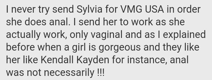 Whatever, that statement for me blows his "just for fun" claim clean out of the water as he's practically just said that he has A LOT of money tied up in Sylvia. He says that "she has decided the next company to get her ass will be Tushy" but from what he just said above that decision is out of her hands and into whoever has the money? Again claiming she will not be in the U.S. next week suggests he has control of her.