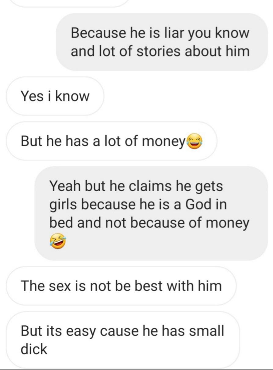 What is this bullshit that he write??? A girl don't have to start with him to be good for a conpetitor to like her. This guy has no brain cells. I already had girls tell me that sex with Pierre is not the best. They don't even like anal and that they did it with him only because he has a lot of money and because the sex was "easy" because of his small dick. Their words, not mine. He need a reality check to come down to earth. He behave like he is some kind of God where he do things better than anyone. He is not a good starting point for anyone.