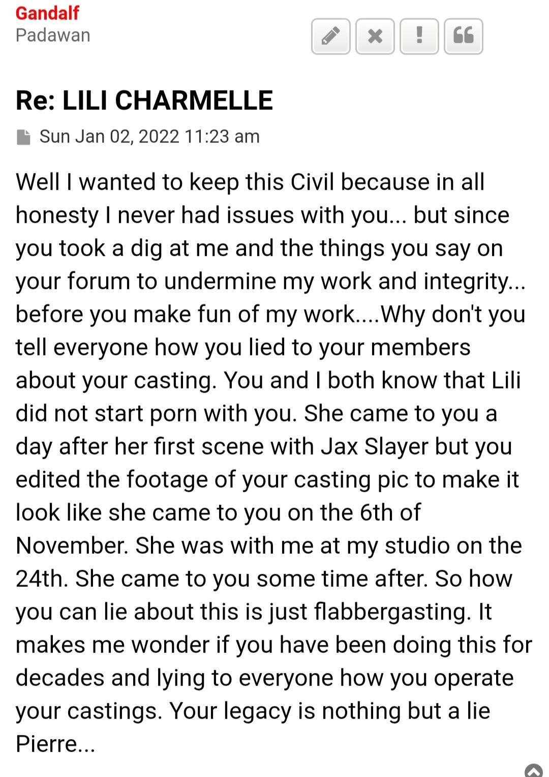 Its going to be interesting how he responds to the Lili Charmelle comment, he's so far answered everyone's posts except that one so I guess we're going to get the full page Woodman Sermon full of more lies. This guy below on the Euro Babe Forum passed one little comment and got a speech back from Pierre criticizing every other actor out there! The guy never knows when to stop digging.