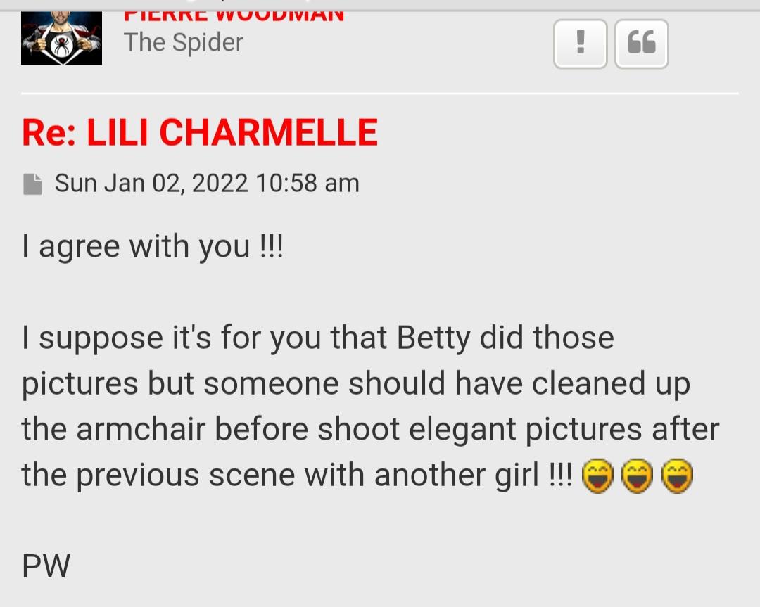 Pierre's been itching to show that picture of Lili judging by the way he was hinting to his faithful last month. Let's hope he's had Lili's permission to show it because if he hasn't. . . . . Doesn't put her in a very good light either I would guess with other producers if she's going around letting Pierre take pictures of her to use as ammunition against them! Not a very good move on his part for Lili, but I guess he didn't think about that, unsurprisingly!